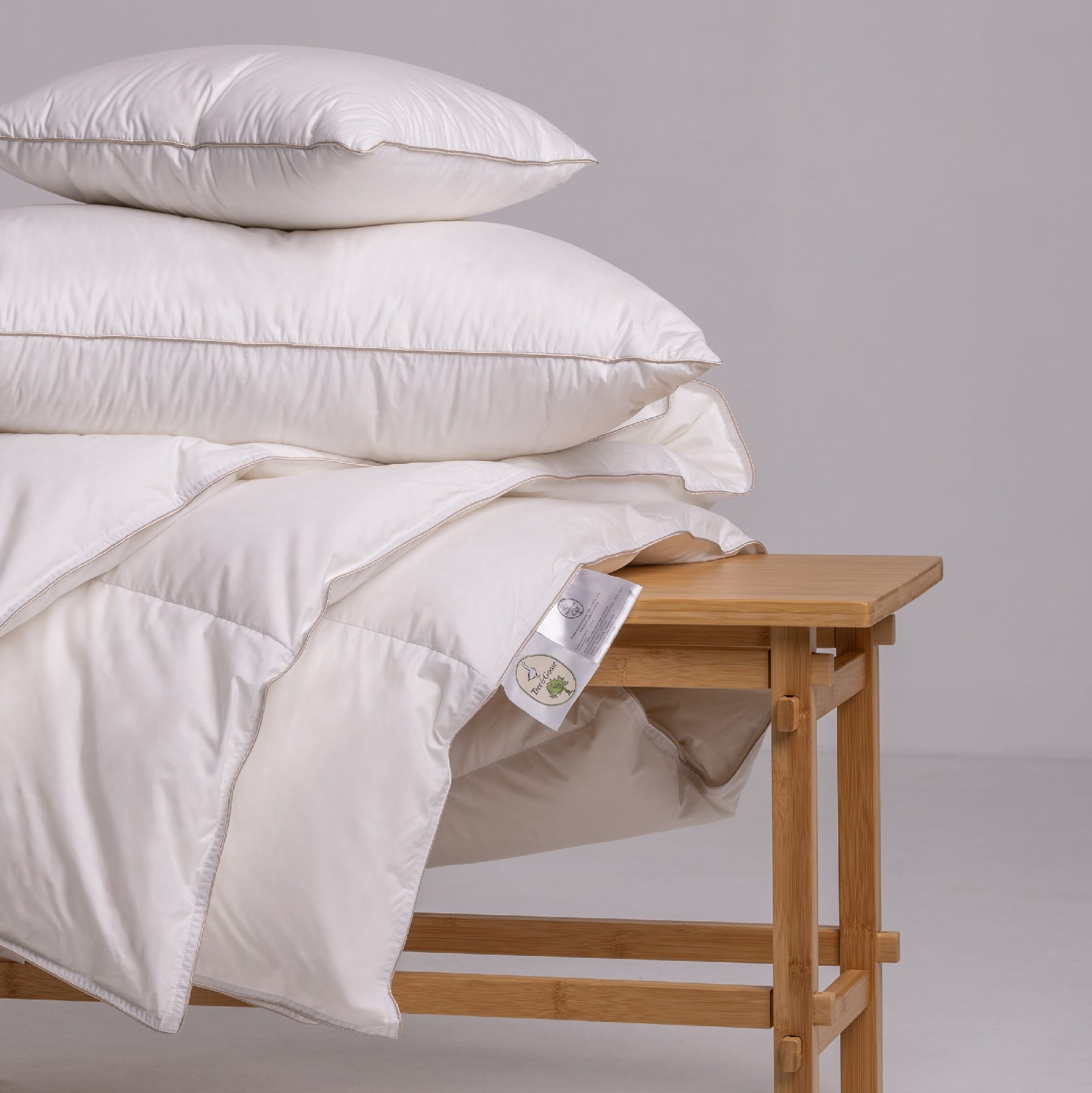 Zewnętrzne komory wypełnione są w 100% najwyższej jakości puchem gęsim klasy I, o imponującym poziomie czystości 1000 mm, co gwarantuje wyjątkową lekkość, przewiewność i puszystość. Naturalne właściwości puchu wspierają prawidłową cyrkulację powietrza, ograniczają pocenie i sprzyjają spokojnemu, komfortowemu wypoczynkowi przez całą noc.