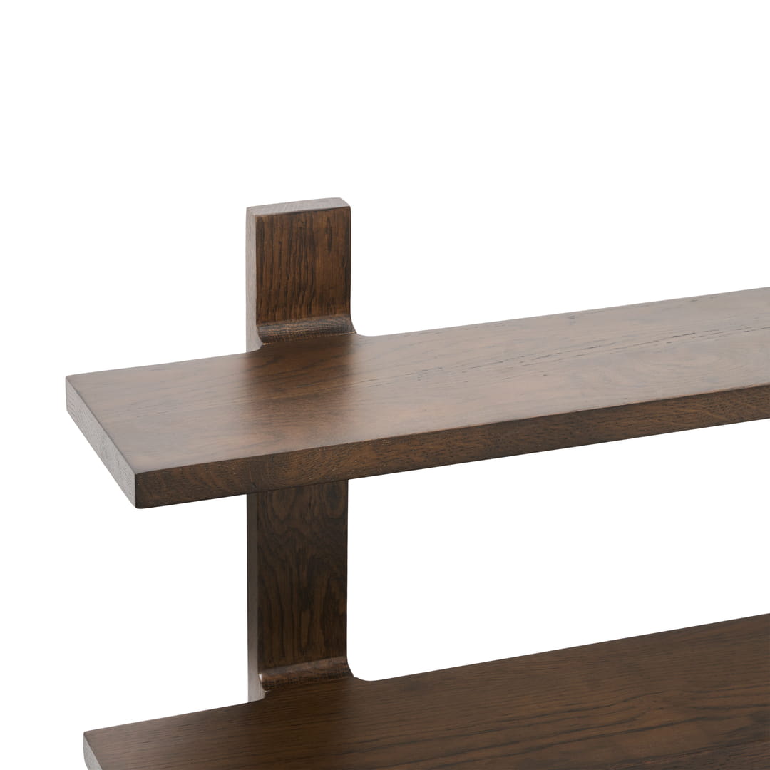 Wykonana z drewna dębowego, półka Tay Muubs zachwyca naturalnym rysunkiem drewna i ciepłym, autentycznym kolorem, który wnosi do pomieszczenia przytulny, a jednocześnie ekskluzywny charakter. Dwupoziomowa konstrukcja zapewnia miejsce na ulubione dekoracje, książki, rośliny doniczkowe, a także praktyczne przedmioty, które chcesz mieć zawsze pod ręką.