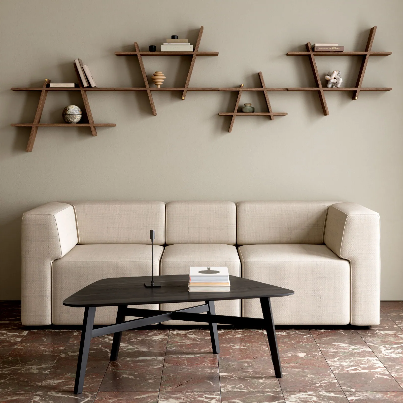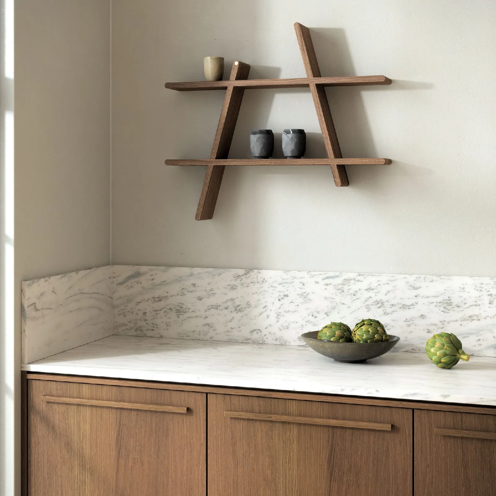 Drewniana półka A-Shelf stanowi zarówno praktyczną przestrzeń do przechowywania, jak również jest dekoracyjną półkę ścienną, idealną do eksponowania ulubionych drobiazgów domowych. Jej asymetryczny design podkreśla lekkość i minimalistyczną estetykę skandynawskiego stylu.