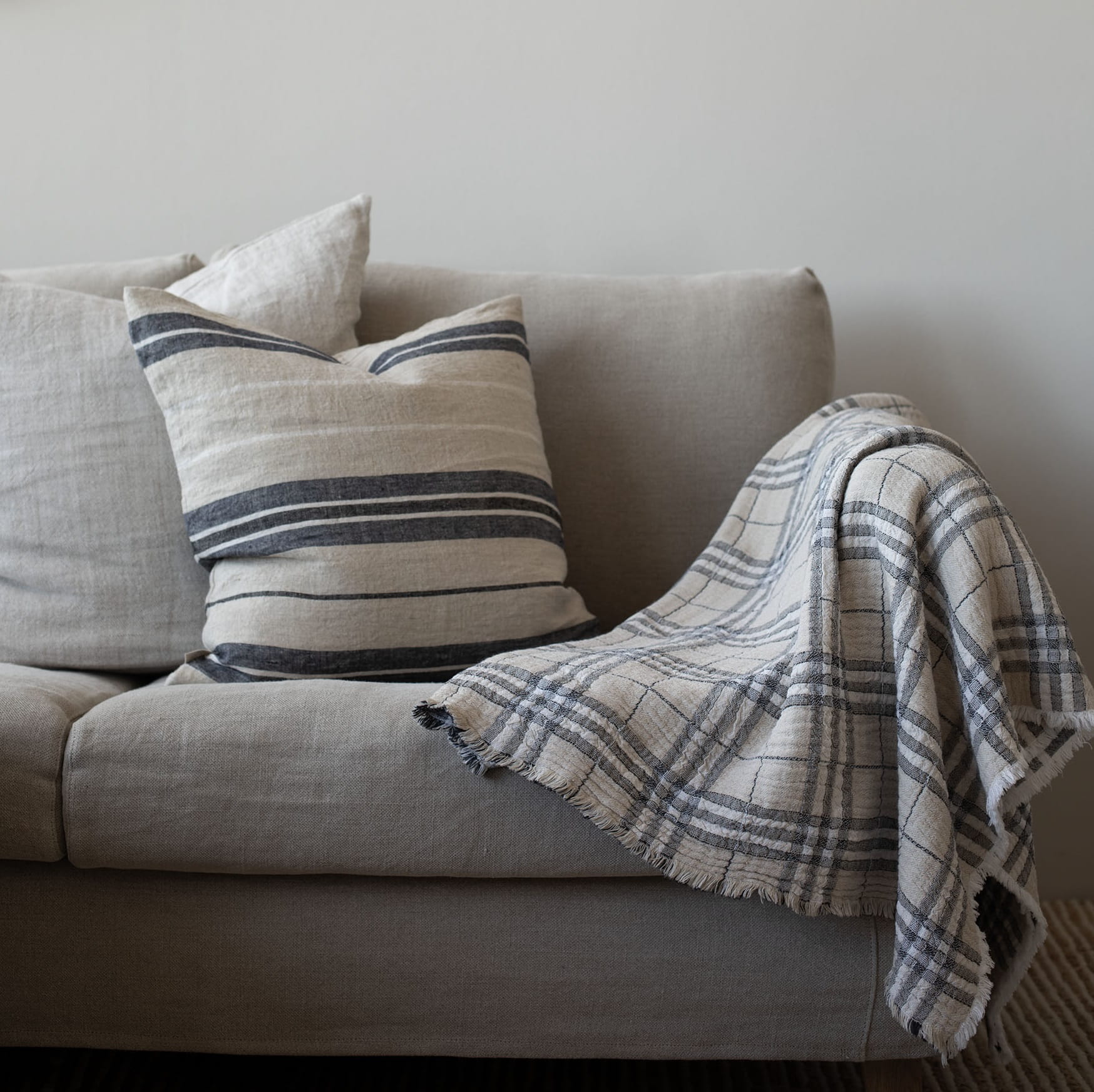 Mika to wyjątkowa poszewka na poduszkę o wymiarach 50x50 cm, stworzona z najwyższej jakości, europejskiego lnu. W całości wykonana ze 100% naturalnych włókien lnianych, poszewka zachwyca trwałością i charakterystyczną, przyjemną w dotyku fakturą. Jej klasyczny, ponadczasowy design z subtelnymi paskami w odcieniach niebieskiego, beżu i bieli doskonale wpisuje się zarówno w przytulne, rustykalne wnętrza, jak i nowoczesne, minimalistyczne aranżacje.