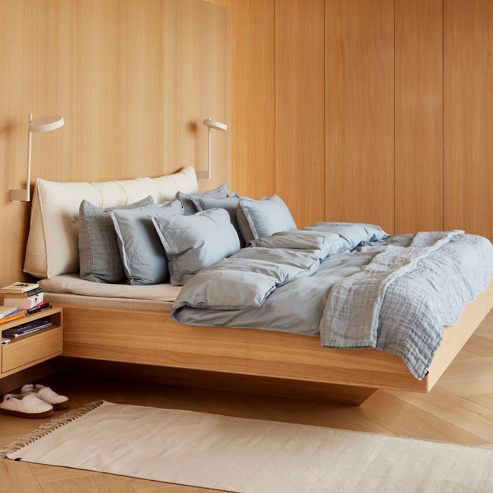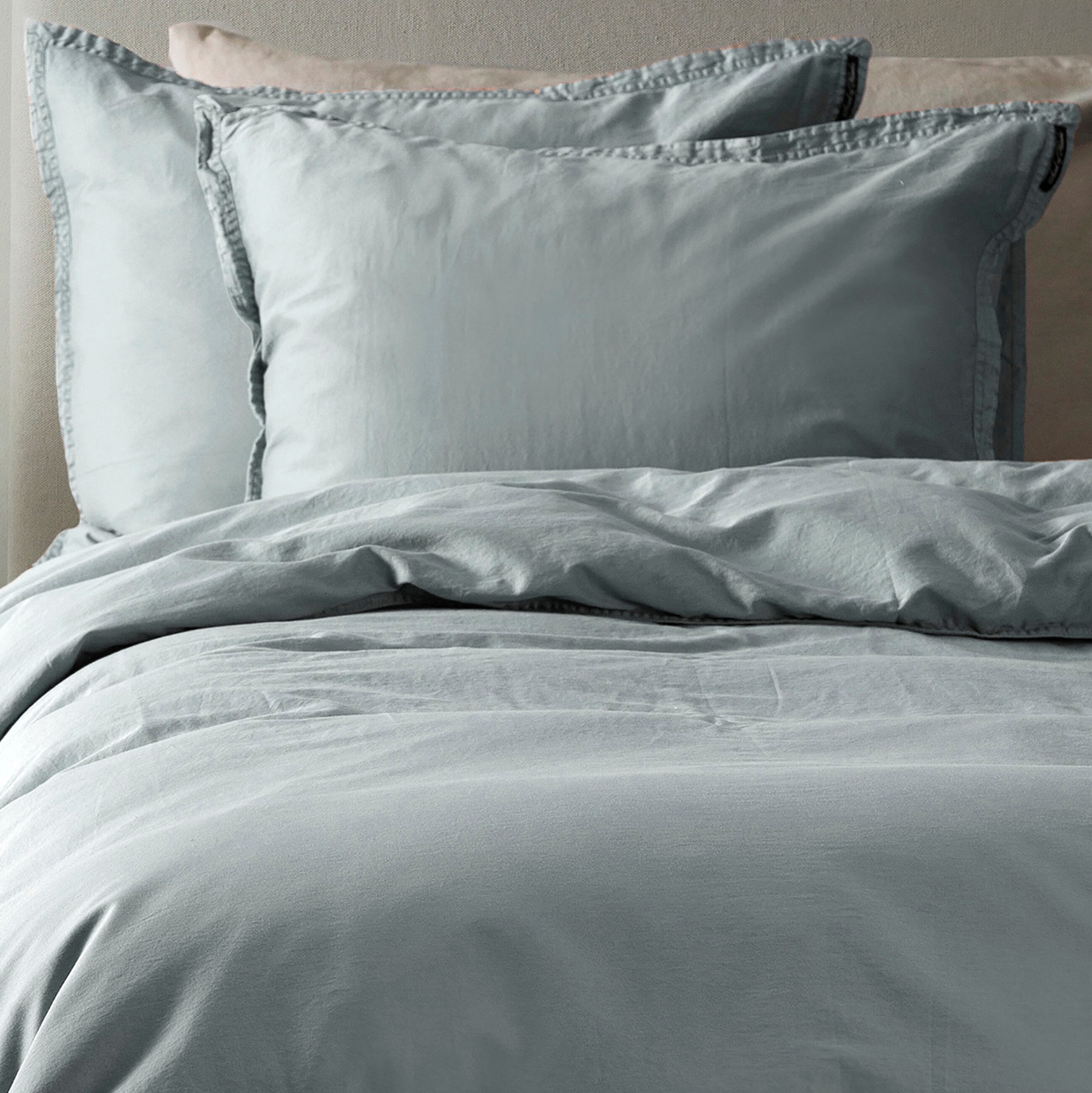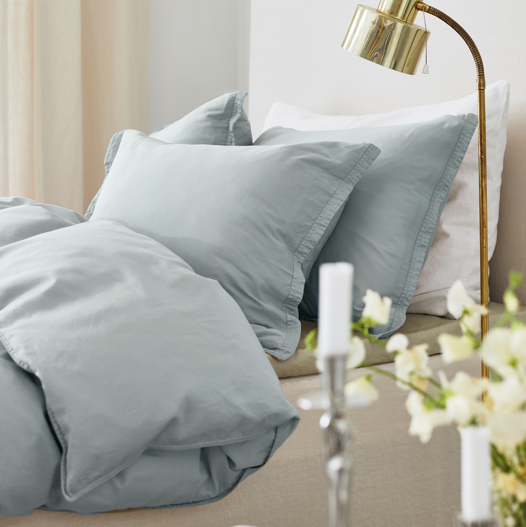 Błękitne poszewki satynowe w odcieniu Cloudy Sky nadają łóżku harmonijny i lekki wygląd.