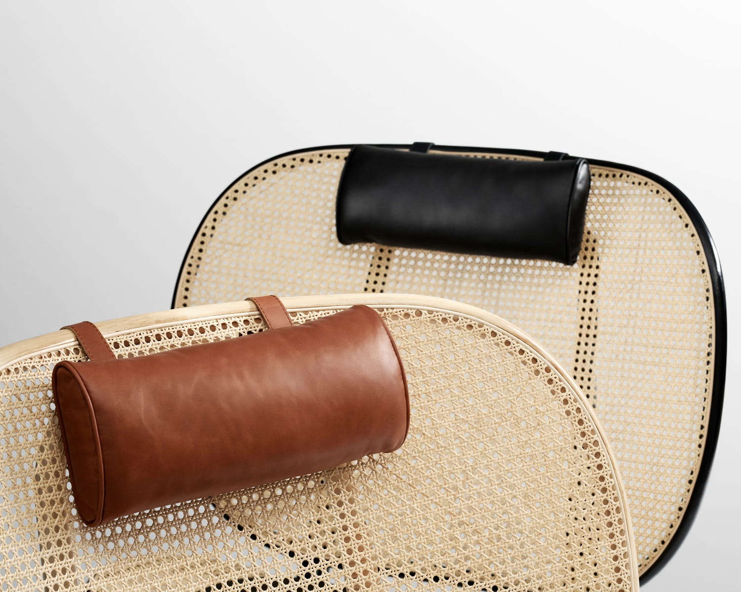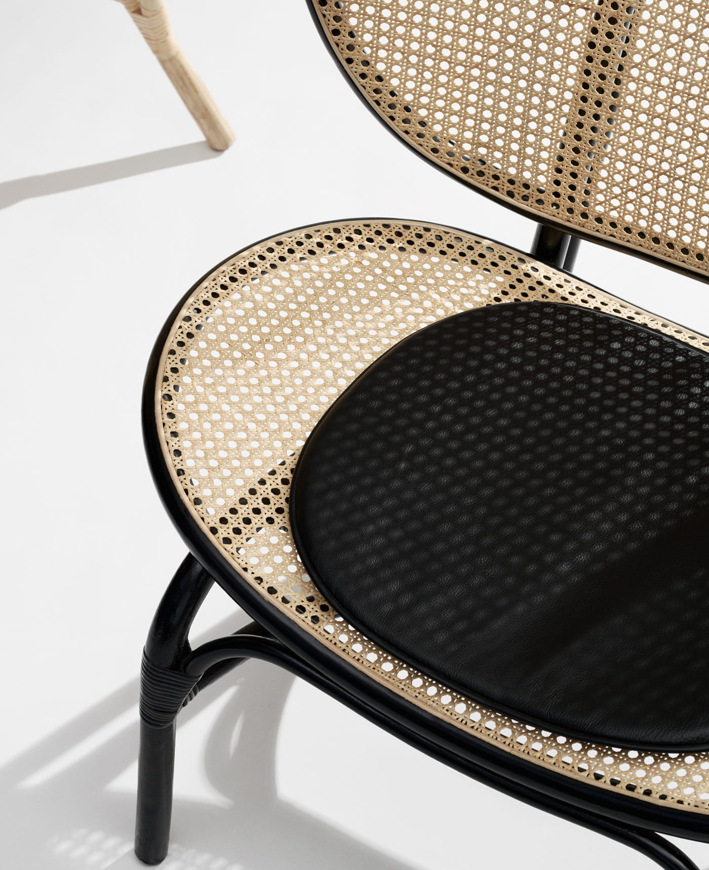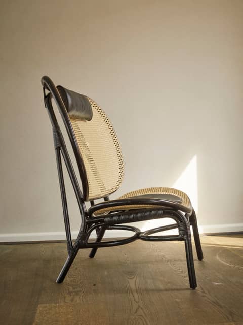 Konstrukcja fotela wykonana jest z trwałego bambusa, dwóch formowanych ram, a siedzisko i oparcie z francuskiego rattanu, który dzięki swojej ażurowej strukturze nadaje meblowi lekkości i elegancji, podkreślając piękno ramy. Do zestawu dołączone są wygodne poduszki – jedna na szyję i druga na siedzisko – wykonane z luksusowej skóry anilinowej firmy Sørensen Leather, co dodatkowo podnosi komfort użytkowania.