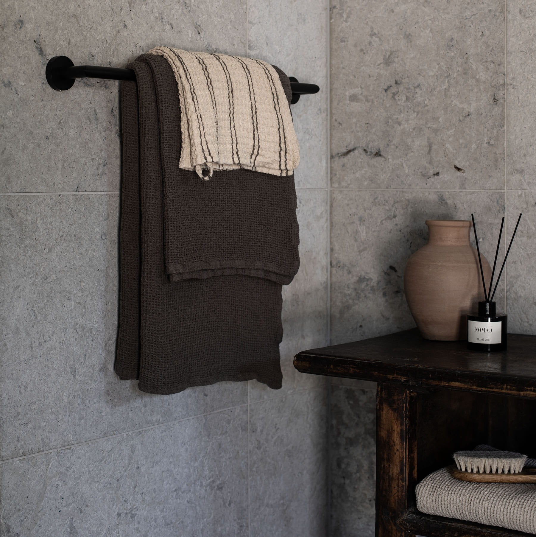 Wyposażony w dwie praktyczne szlufki, ręcznik Nella można wygodnie powiesić w dowolnym miejscu, dzięki czemu zawsze będzie pod ręką. Dostępny w różnych stonowanych wariantach kolorystycznych, dopasuje się do różnych stylów wnętrz – od minimalistycznych aranżacji po klasyczne, przytulne łazienki.