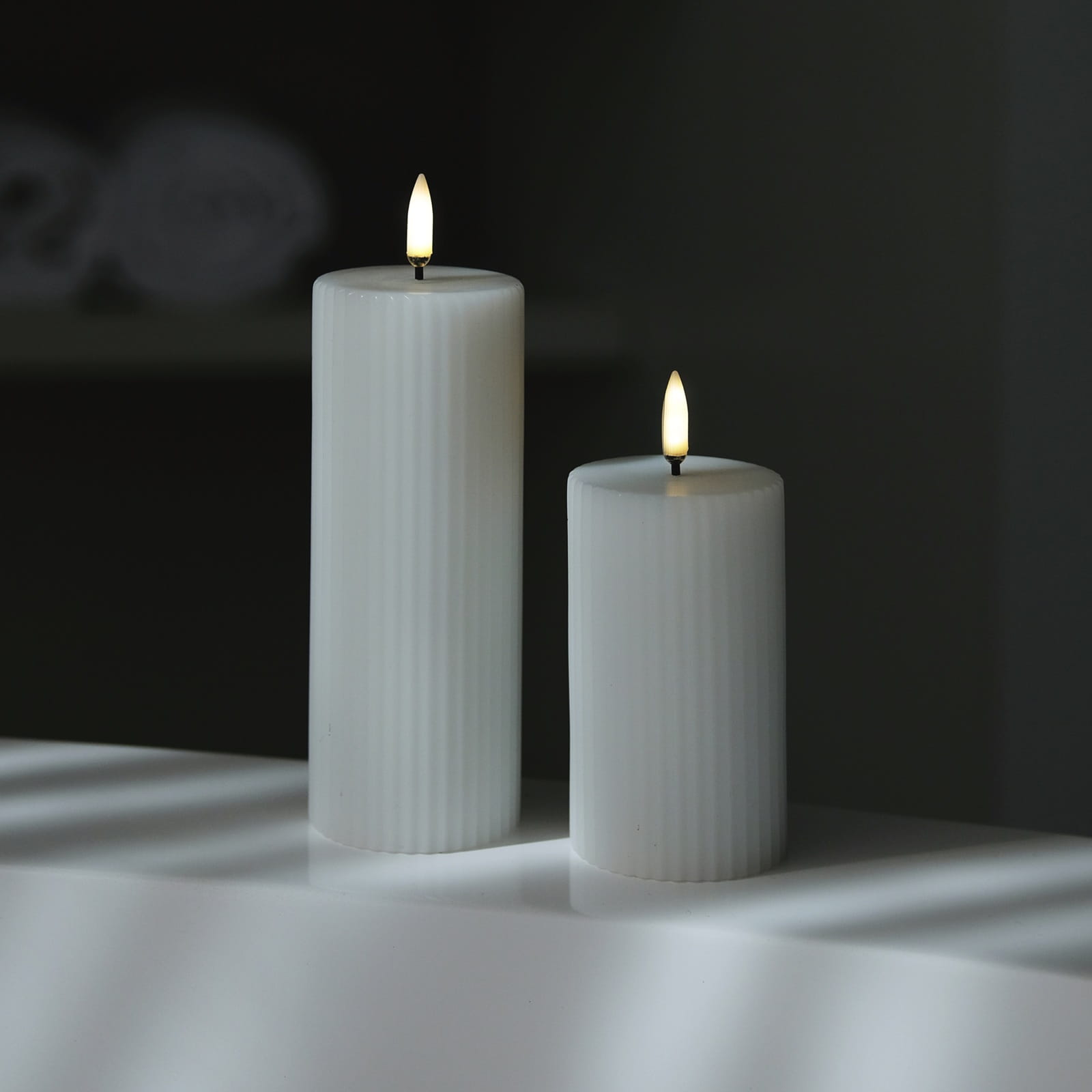Pionowe, ręcznie rzeźbione rowki nadają bryle głębi i architektonicznego charakteru. To nie jest gładka świeca filarowa – struktura łapie światło i cień, dzięki czemu świeca wygląda efektownie nawet wtedy, gdy nie jest włączona.