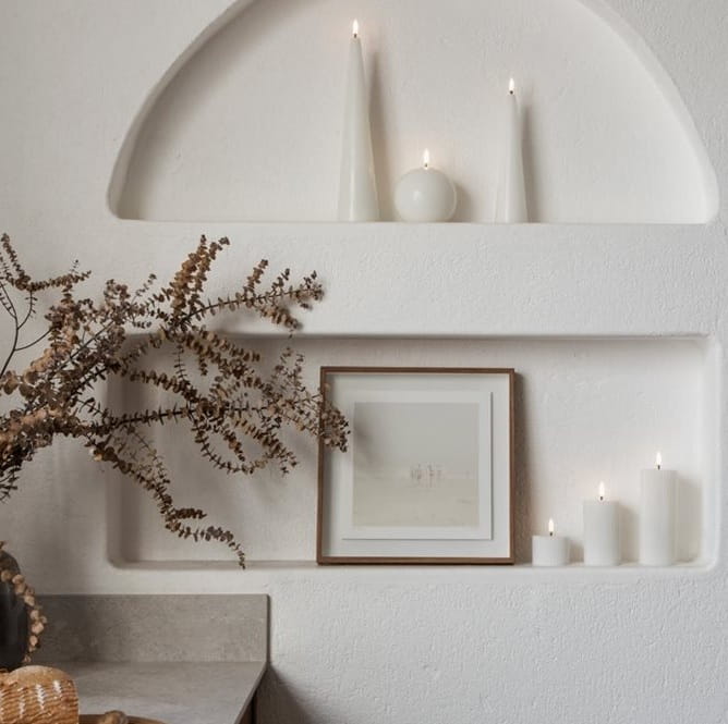 Walec daje bardziej stabilną, masywną obecność niż świeca stożkowa. Buduje punkt światła – mocny, spokojny, wyważony. Idealny do ustawienia pojedynczo na tacy, w latarni, na konsoli czy stoliku kawowym.