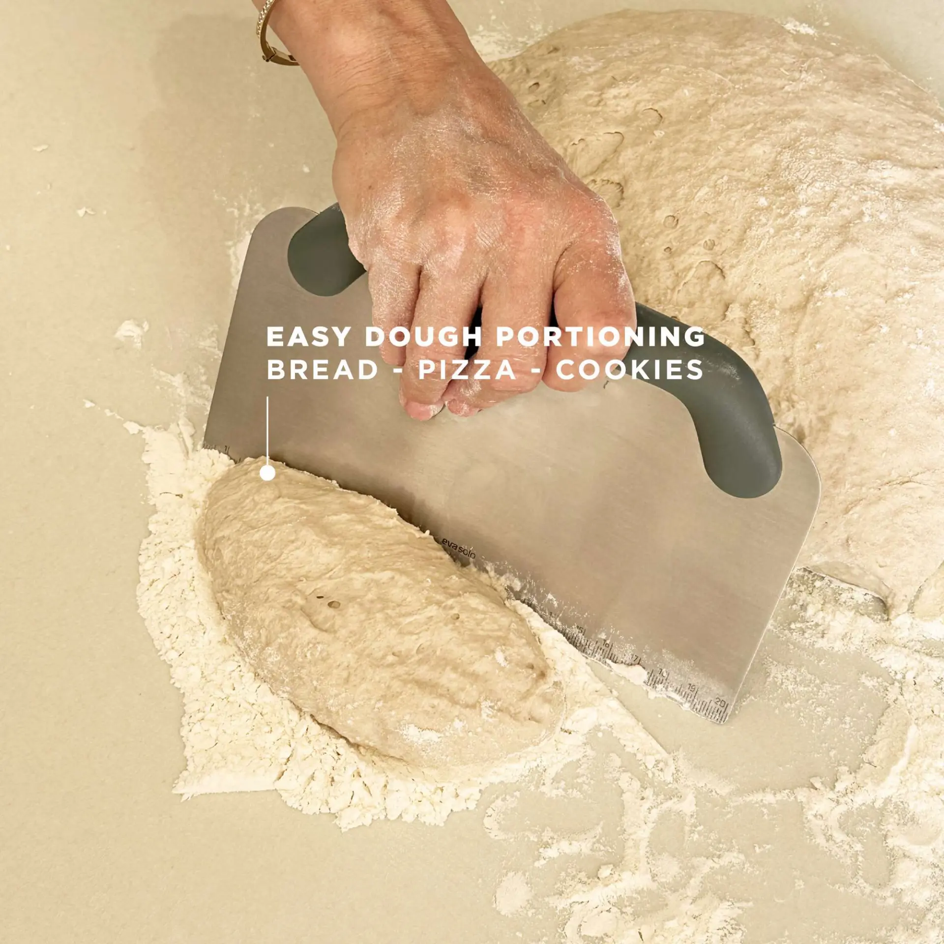 To metalowy skrobak do ciasta na chleb i pizzę, który eliminuje nierówne porcje i przypadkowe szarpanie struktury.