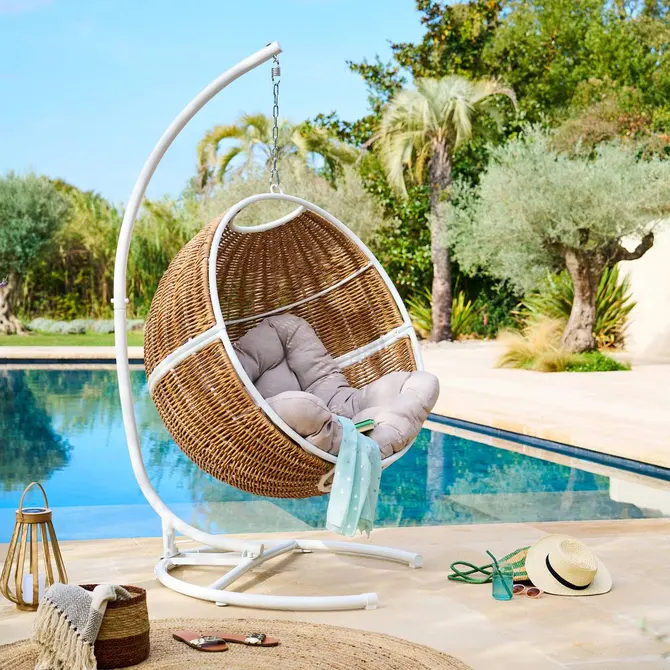Wystarczy ustawić stojak na płaskiej powierzchni – tarasie, patio lub balkonie – i zawiesić kompatybilny fotel. To rozwiązanie dla osób, które cenią elastyczność aranżacji i możliwość zmiany ustawienia mebla.