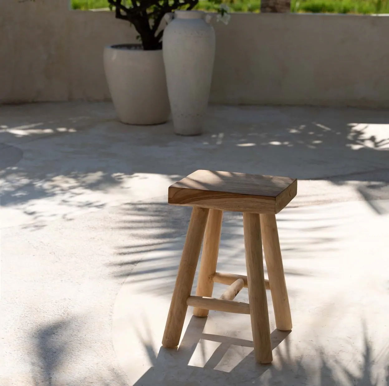 Egzotyczne drewno suar nadaje stołkowi niepowtarzalny charakter dzięki wyrazistym, naturalnym słojom i wyjątkowej trwałości. Drewno tekowe, cenione za odporność na wodę i plamy, dodaje wytrzymałości i elegancji. Każdy egzemplarz jest unikalny, z indywidualnym usłojeniem i barwą.