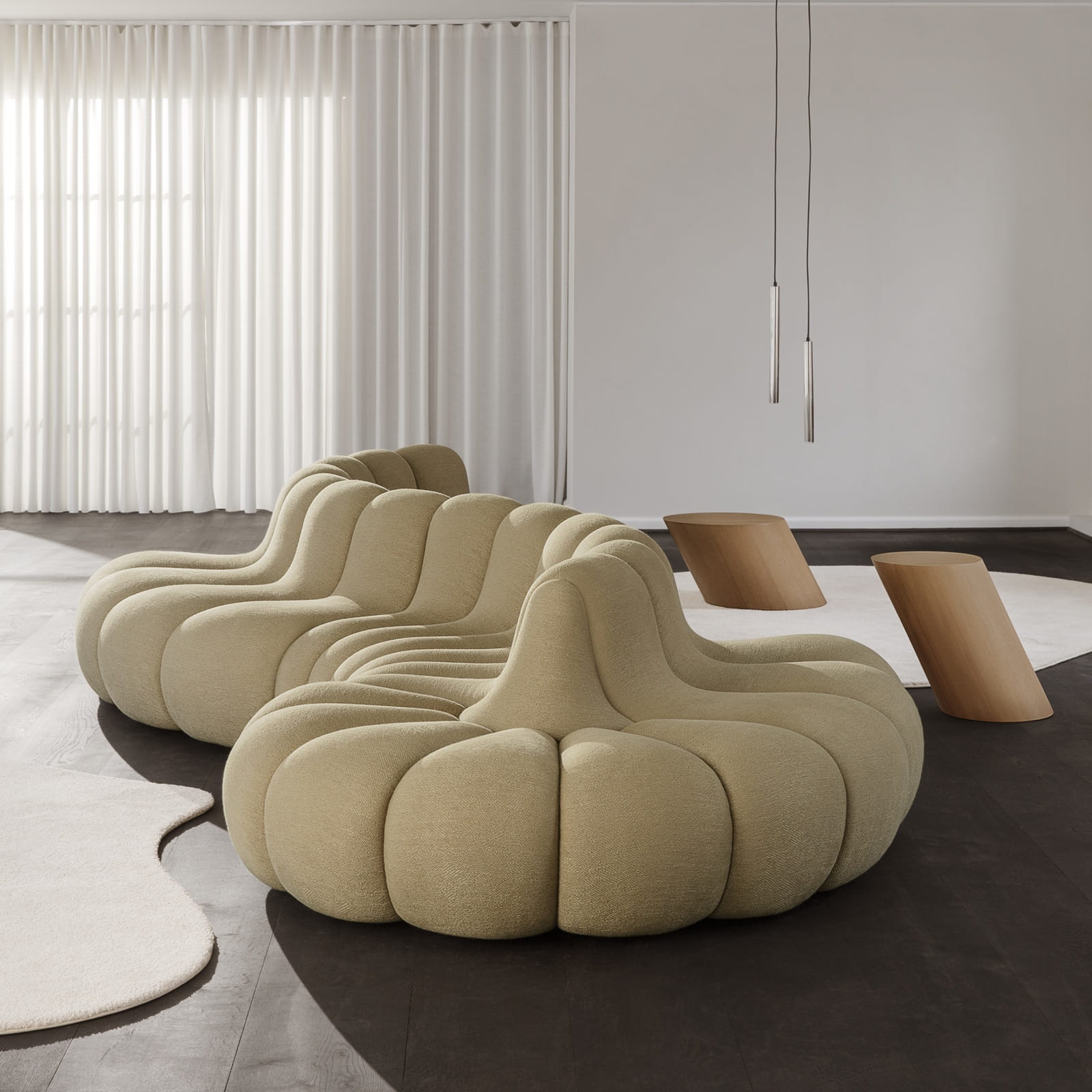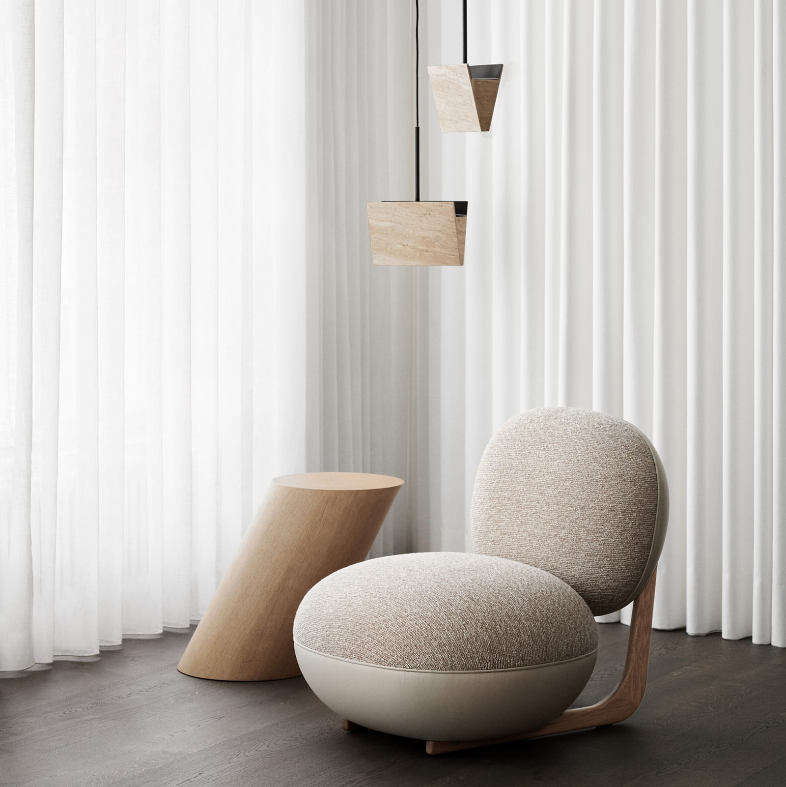 Tilt ma formę ukośnego walca, która nadaje mu rzeźbiarski, ale uporządkowany wyraz. To stolik kawowy, który przyciąga uwagę proporcjami i bryłą, bez potrzeby dodatkowych detali. Minimalistyczna geometria nawiązuje do odważnego wzornictwa lat 80., zachowując jednocześnie ponadczasowy charakter i czytelność formy.