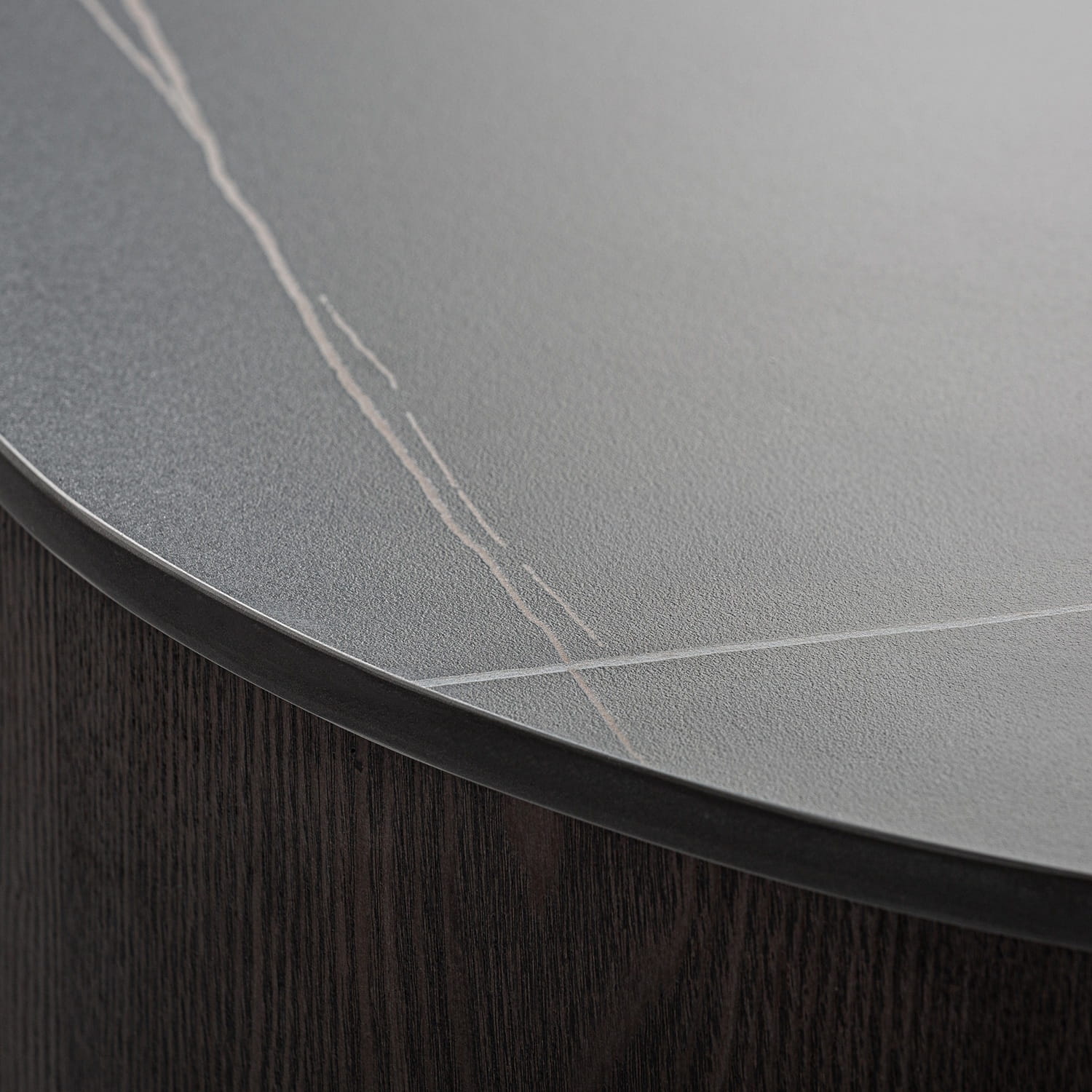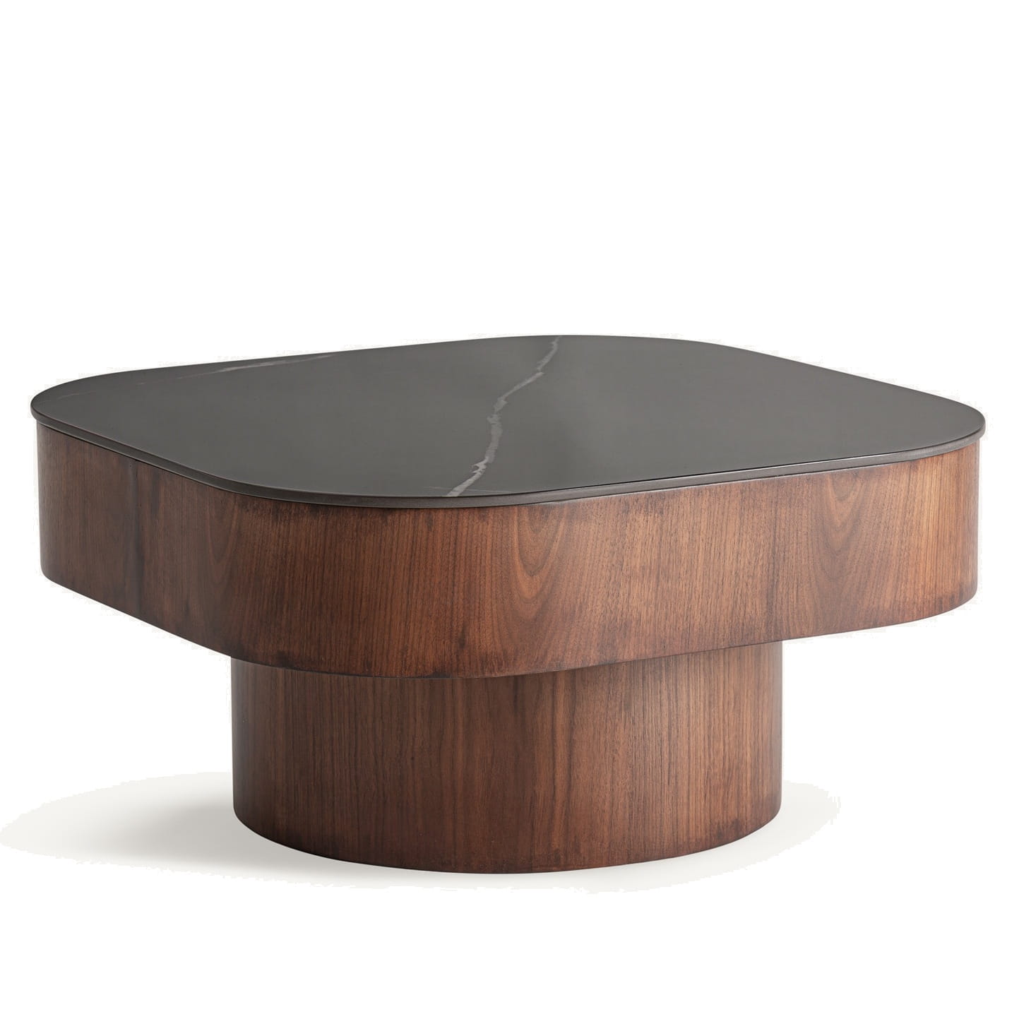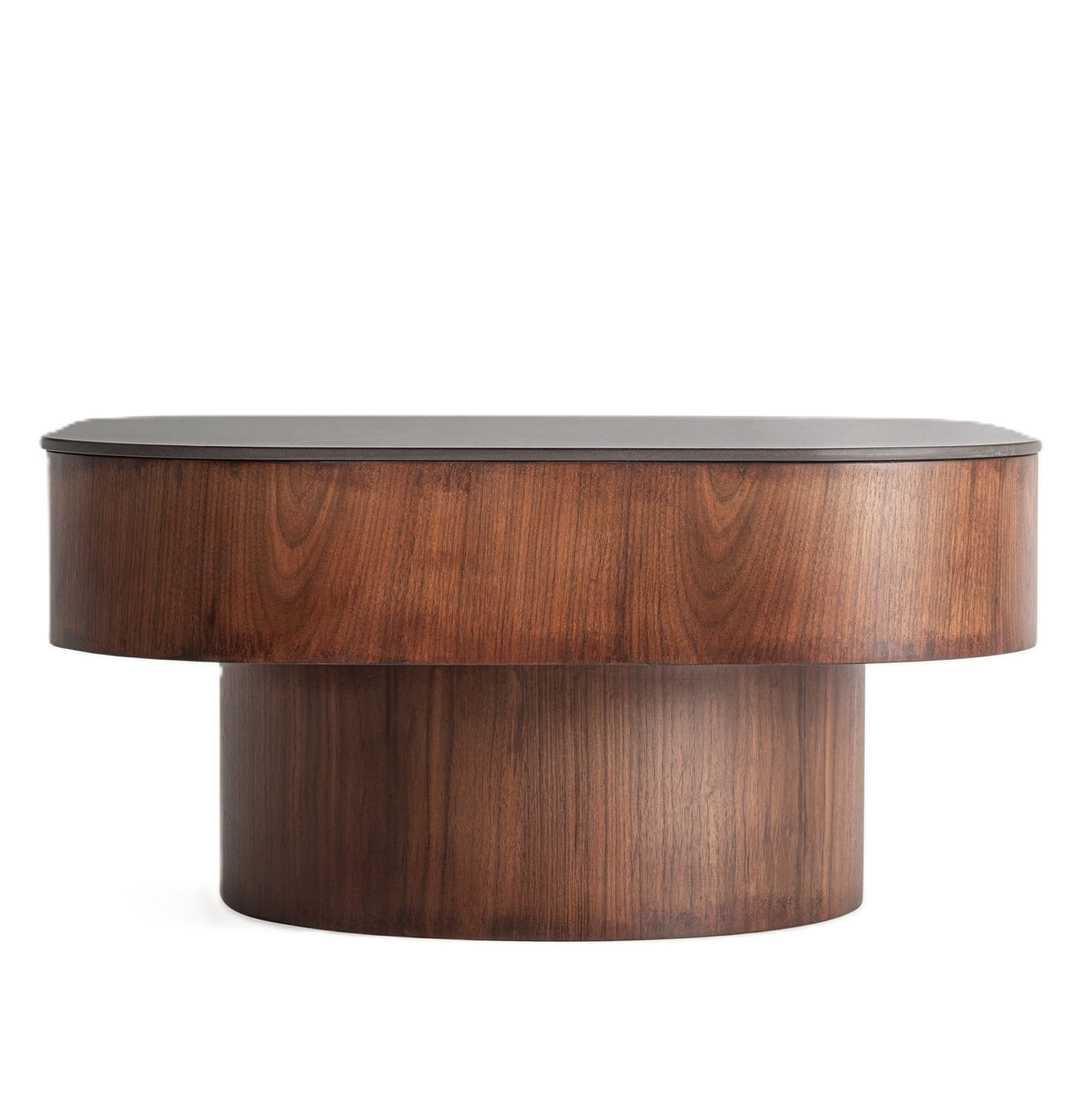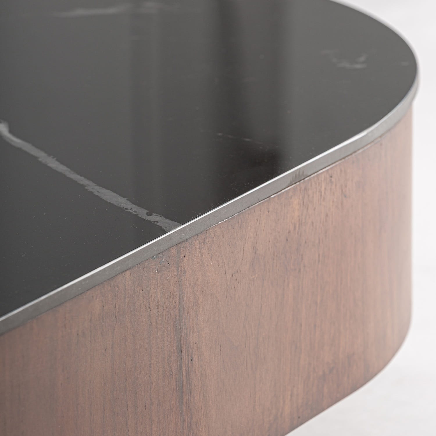 Blat wykonany z czarnego marmuru syntetycznego prezentuje się elegancko i jest odporny na codzienne użytkowanie. Jego gładka powierzchnia kontrastuje z podstawą wykończoną fornirem orzechowym, który wnosi do wnętrza ciepło i naturalną głębię koloru. Stabilna konstrukcja zapewnia komfort użytkowania, a masywność bryły daje poczucie solidności.