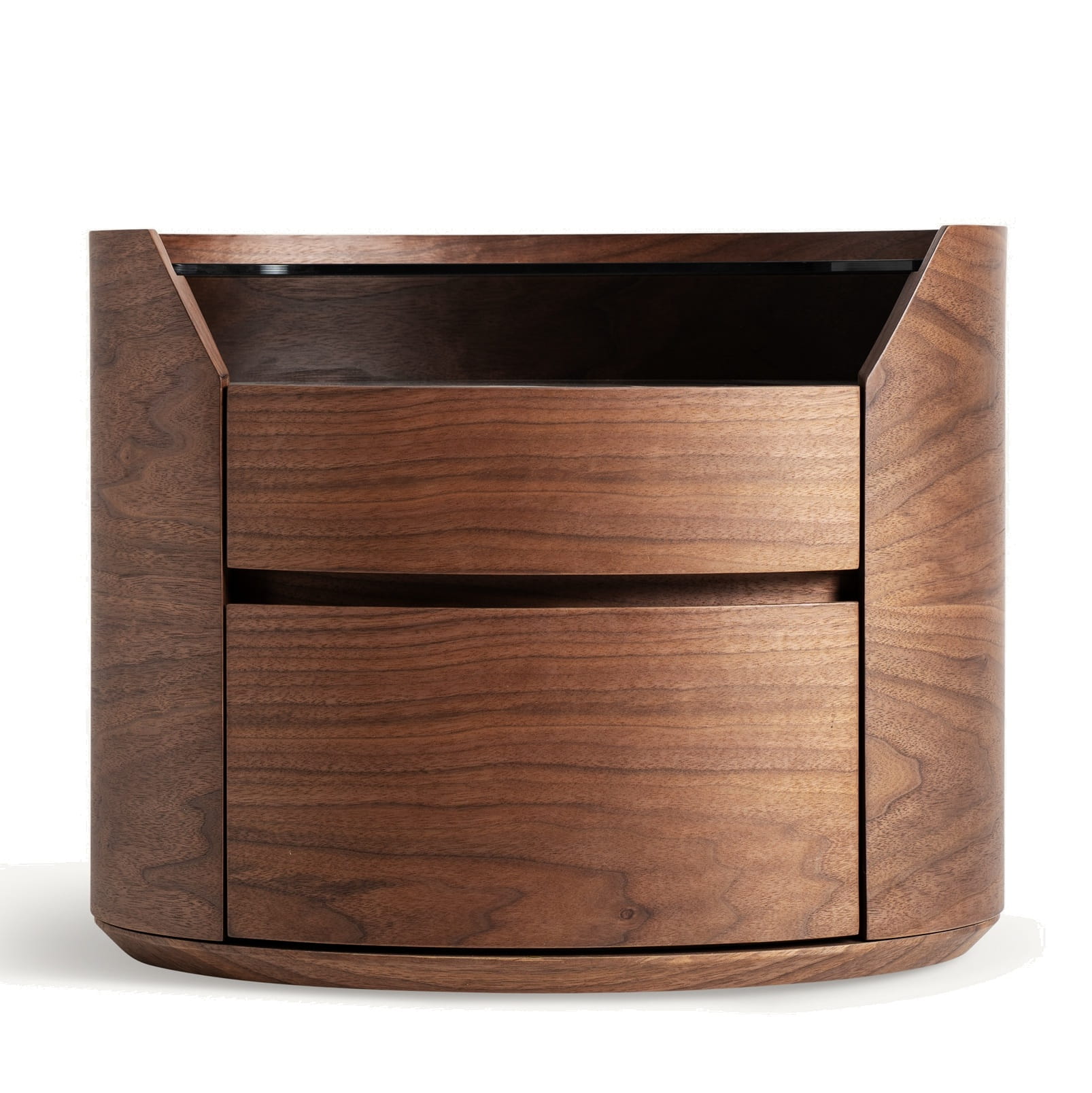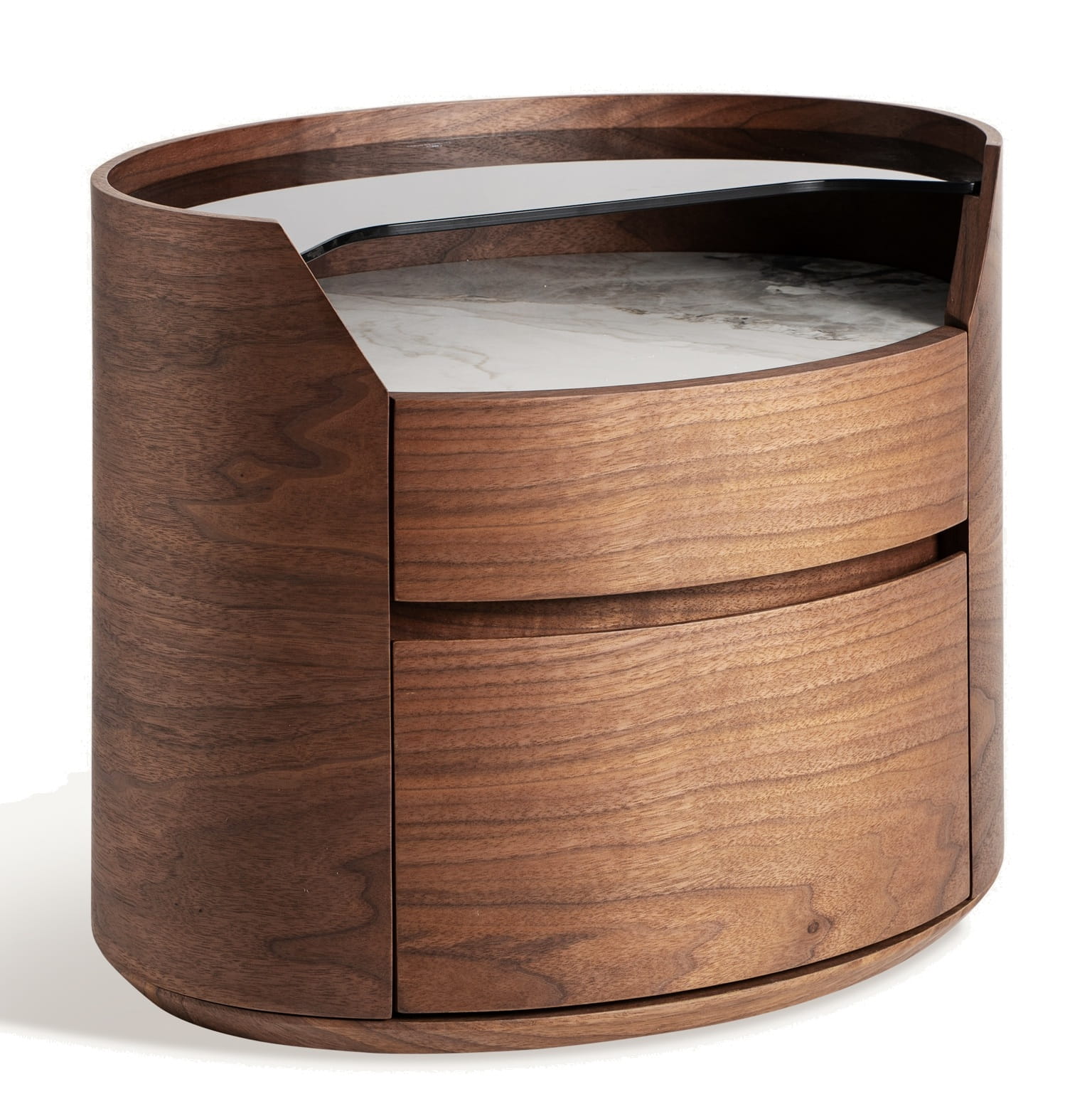 Stolik nocny z szufladami i półką do sypialni, wykonany z brązowej sklejki, szkła i białej ceramiki to mebel zaprojektowany z myślą o uporządkowanej, spokojnej strefie snu. Lecco marki Vical łączy ciepło brązowej miękko uformowanej sklejki, lekkość przezroczystego szkła i precyzję ceramiki, tworząc nocny stolik premium, który od pierwszych sekund komunikuje jakość wykonania i funkcję. Dwie szuflady oraz otwarta półka porządkują przestrzeń przy łóżku, a wyważone proporcje sprawiają, że mebel pracuje zarówno wizualnie, jak i użytkowo — bez nadmiaru formy.
