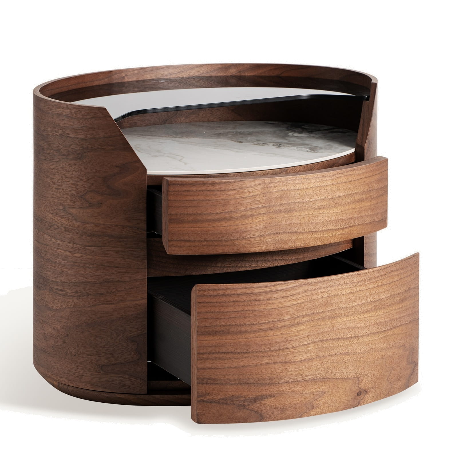 Brązowa sklejka buduje stabilną bryłę, szkło wprowadza wizualną lekkość, a biała ceramika dodaje precyzji i kontrastu. To zestawienie materiałów sprawia, że stolik nocny Lecco pasuje do sypialni nowoczesnych i eleganckich, gdzie liczy się klarowność detalu i trwałość na lata. Zaokrąglona forma tworzy miękkość i wnosi relaksujący nastrój do pomieszczenia.