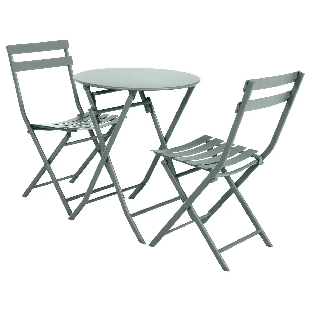 Stolik ogrodowy okrągły składany Greensboro wygląda świetnie jako część trio, gdy towarzyszą mu dwa pasujące stalowe krzesła składane z tej samej kolekcji.