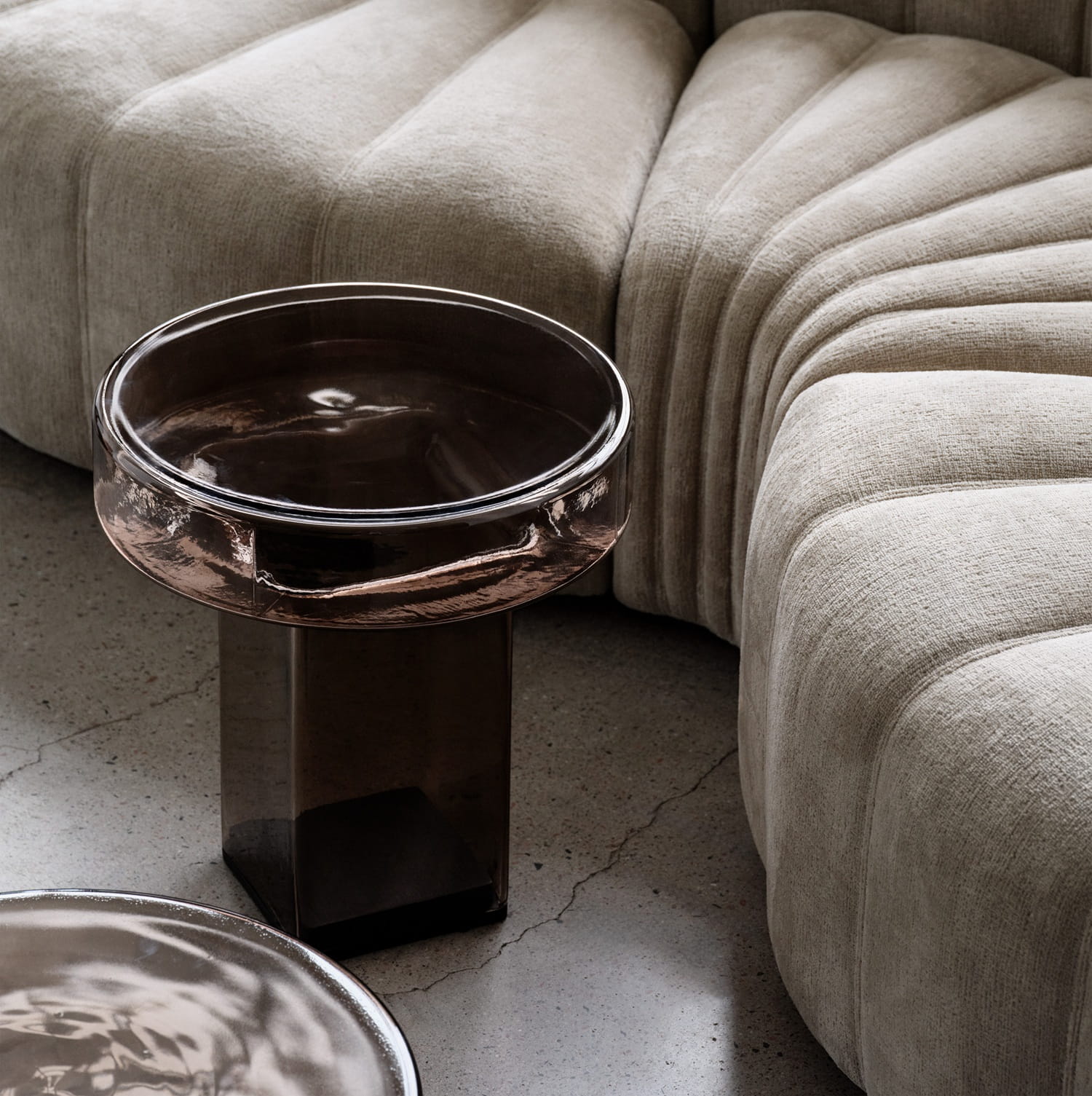 Stolik pomocniczy Naked został zaprojektowany jako prosta, czytelna bryła, w której okrągły blat spoczywa na kolumnowej podstawie. Geometryczna forma jest wyrazista, ale dzięki transparentności szkła nie obciąża wnętrza wizualnie. To stolik, który zaznacza swoją obecność subtelnie – poprzez proporcje, światło i materiał, a nie dekoracyjność.
