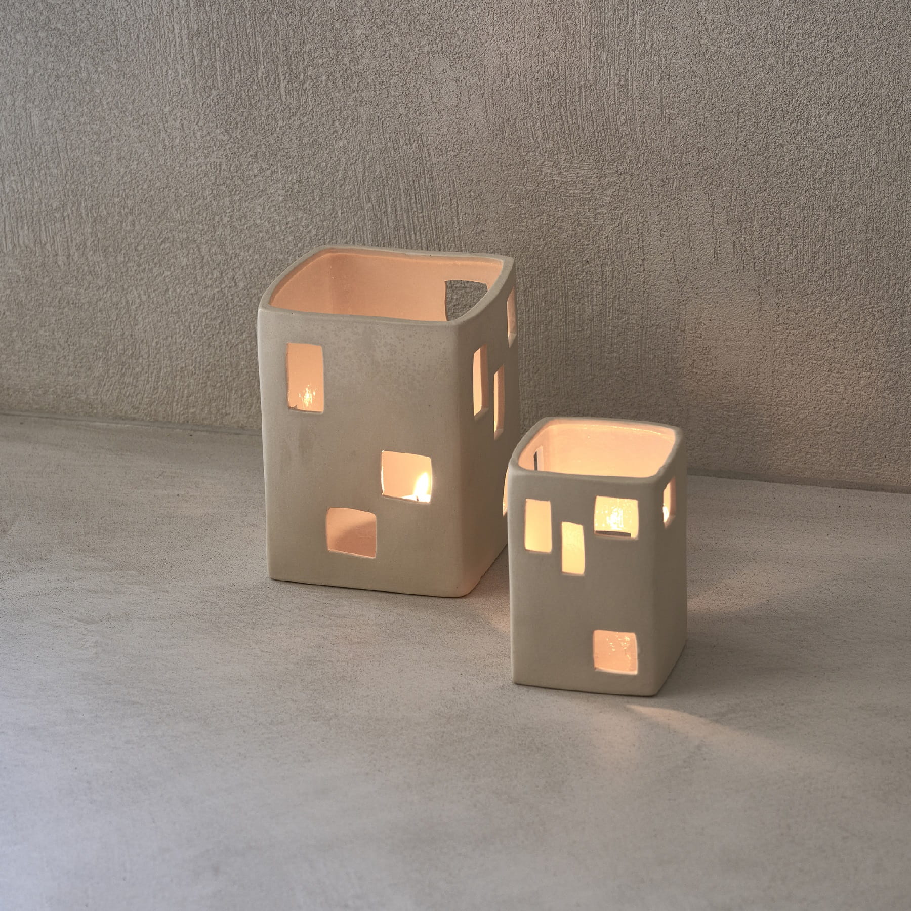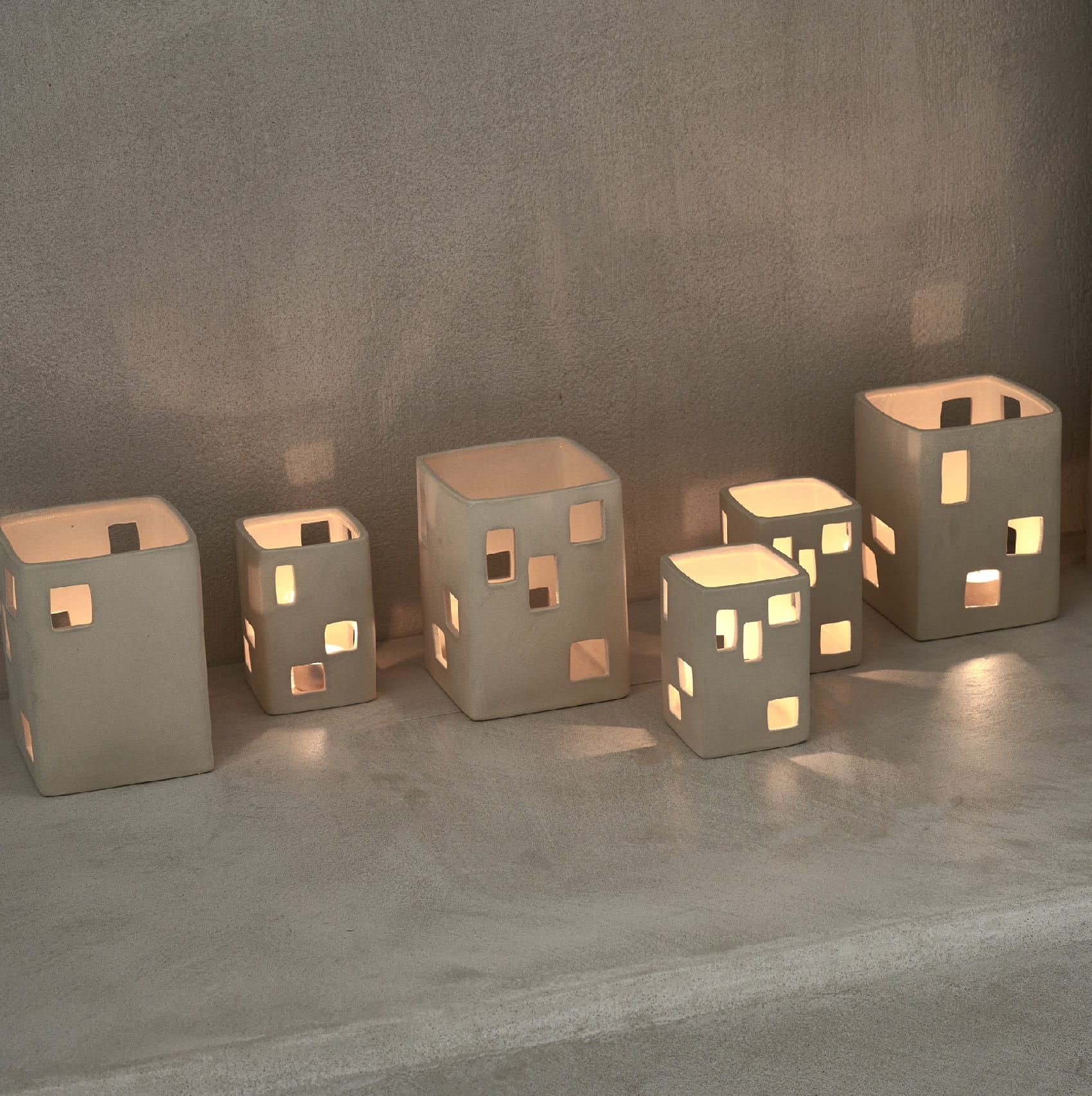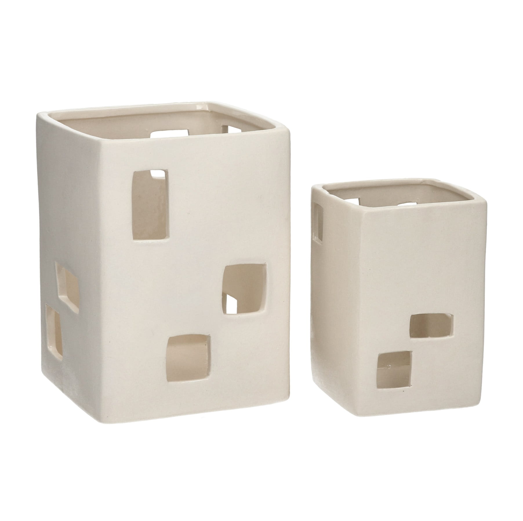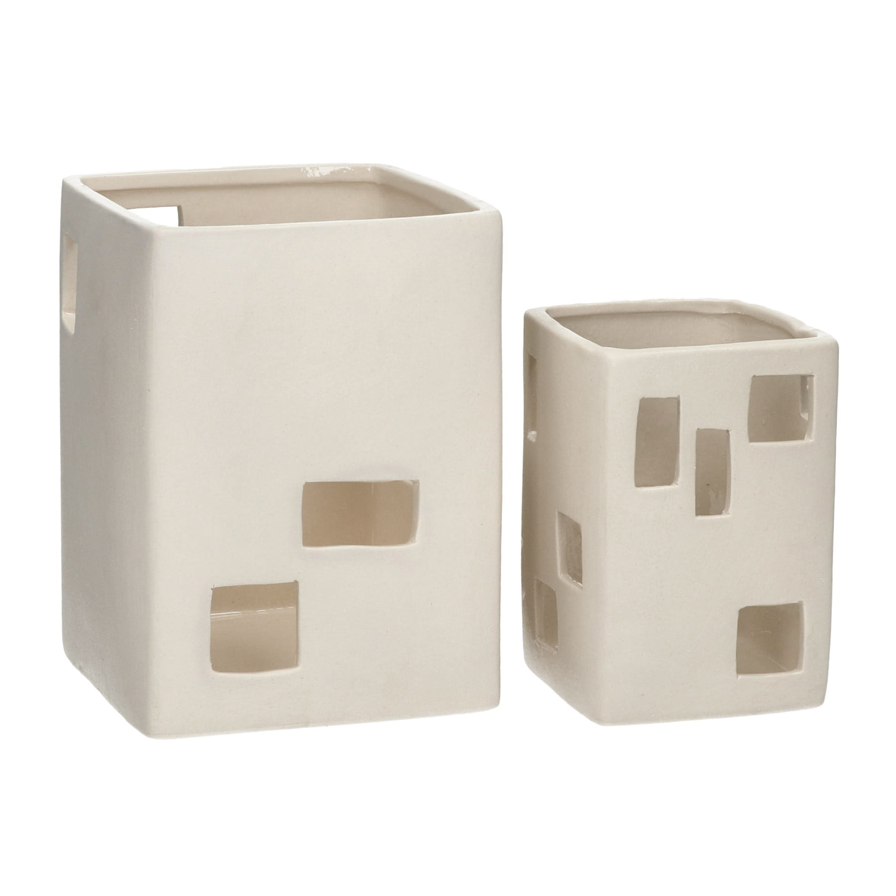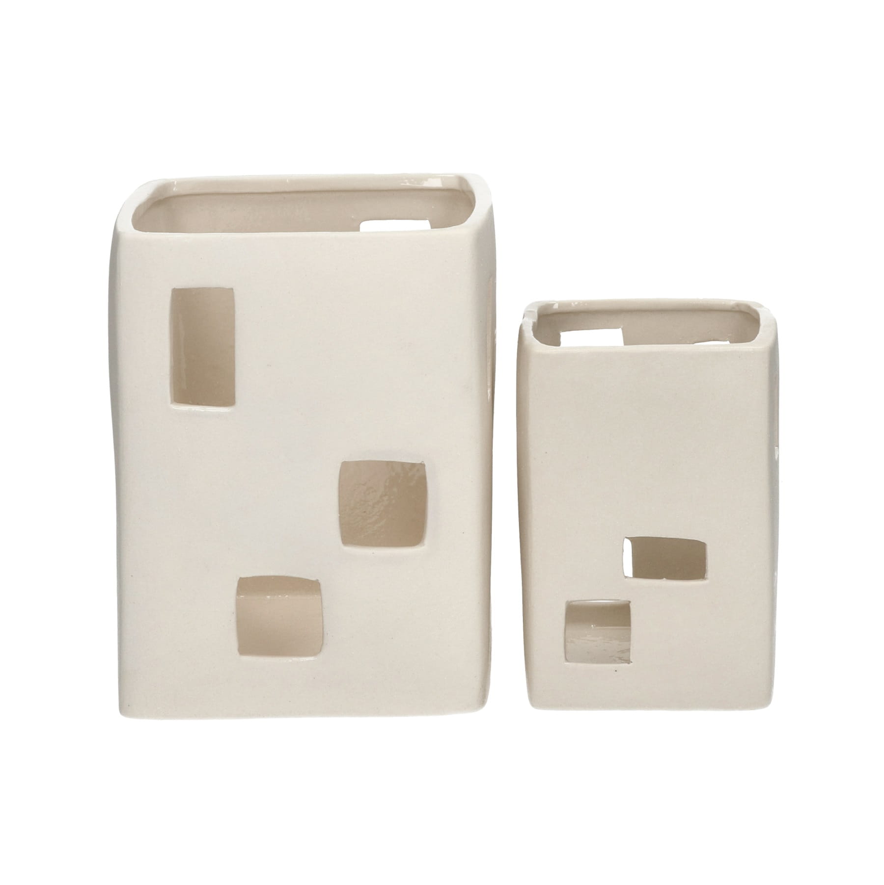 Świeczniki białe porcelanowe Wayang to wyjątkowy zestaw dwóch dekoracyjnych lampionów, które łączą subtelną elegancję porcelany z nastrojowym światłem świec i nowoczesnym wzornictwem. Wykonane z porcelany w odcieniu złamanej bieli, zachwycają unikalnym designem przypominającym małe domki o ażurowych ściankach. Subtelne otwory w strukturze pozwalają światłu świecy miękko przenikać, tworząc na ścianach i meblach przytulną grę cieni, która nadaje wnętrzu magicznej atmosfery.