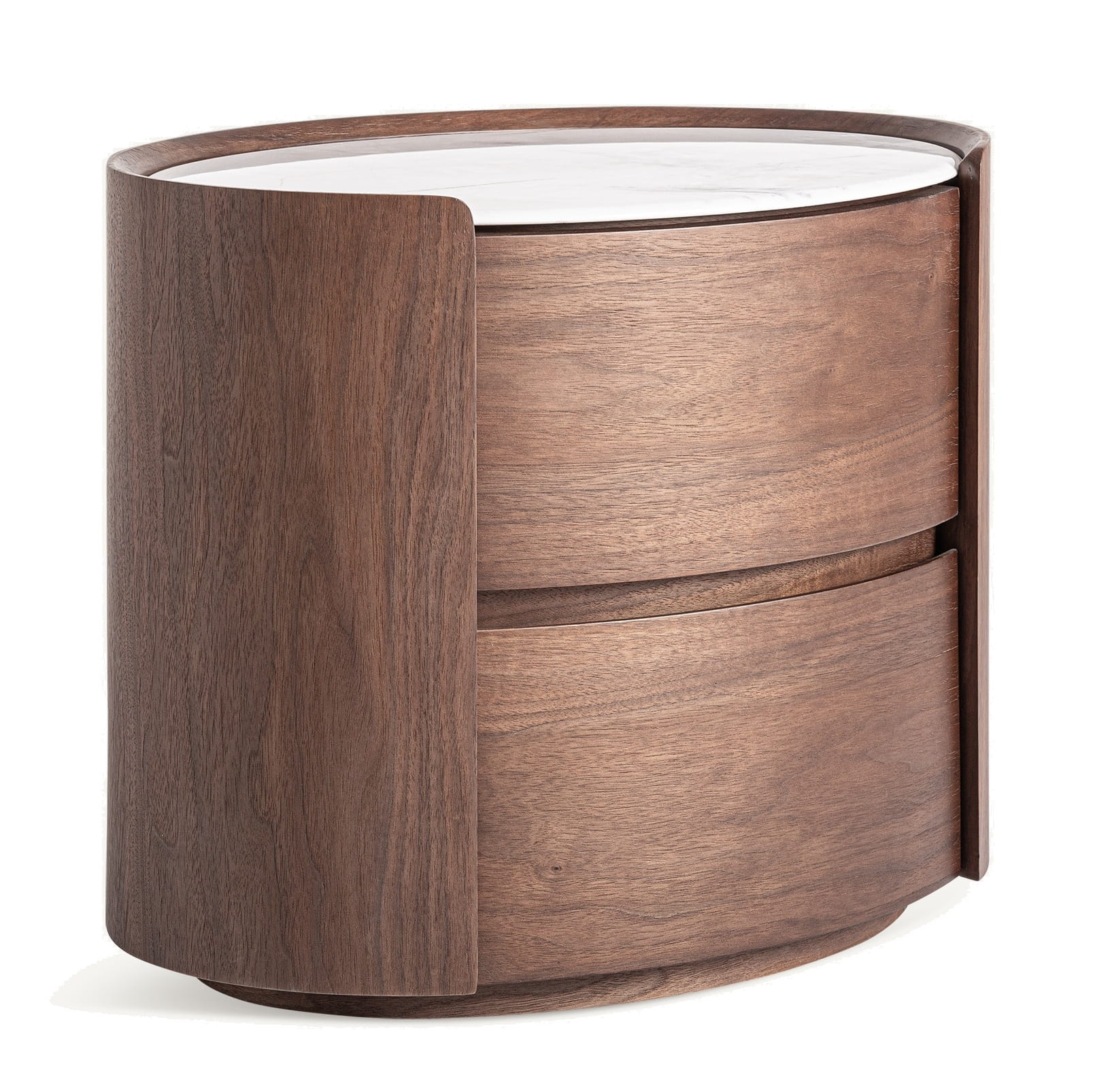 Korpus wykonany ze sklejki w jasnobrązowym odcieniu, wykończony fornirem dębowym, wprowadza do wnętrza naturalne ciepło. Blat z białego spieku kamiennego o subtelnym użyleniu stanowi elegancki kontrast i praktyczną powierzchnię na lampę nocną, książkę czy dekoracje. Ręczne wykonanie sprawia, że każda szafka posiada indywidualny rysunek drewna i delikatne różnice w tonacji materiałów.