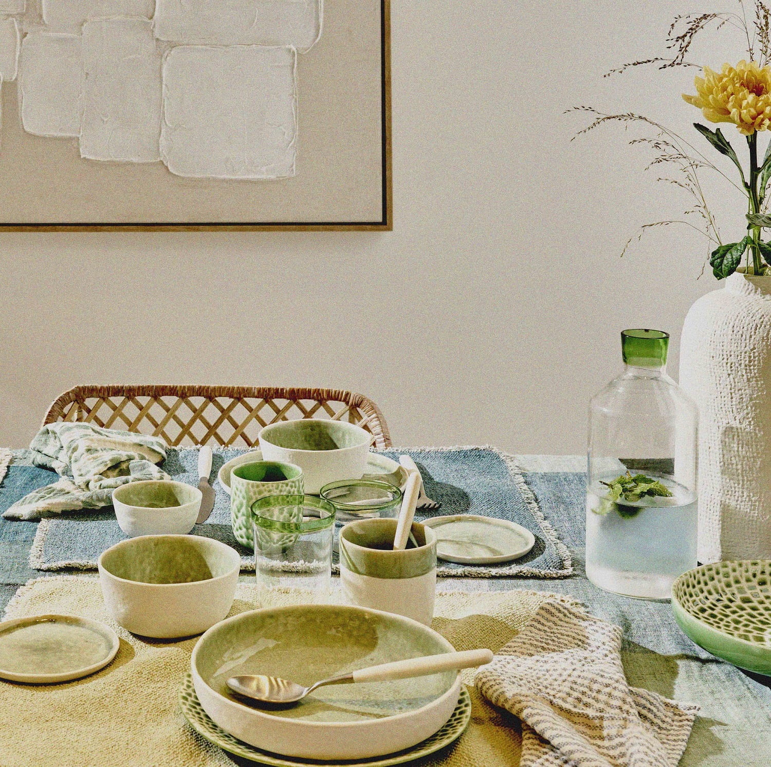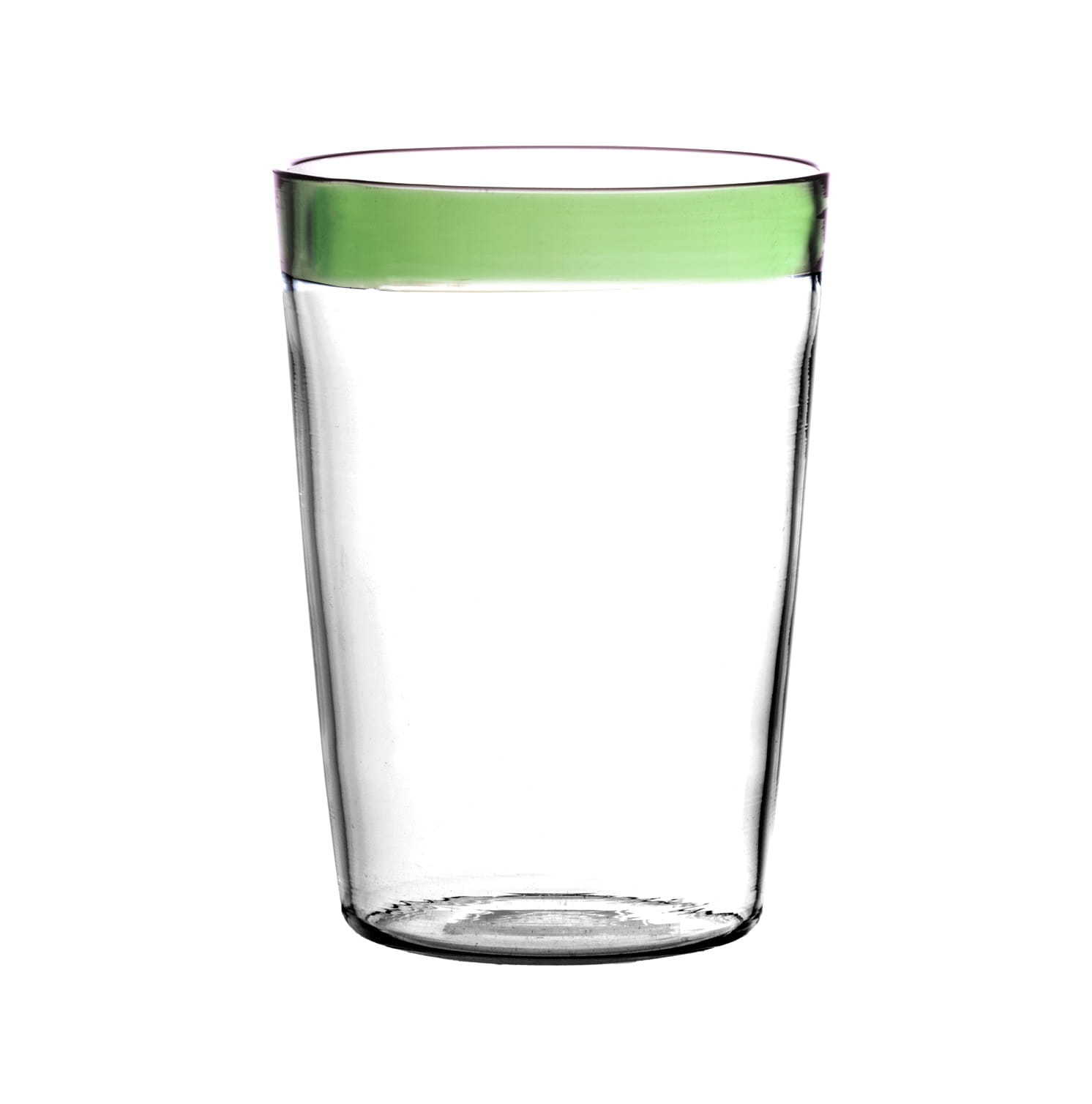 Wykonane z najwyższej jakości szkła borokrzemowego szklanki o pojemności 300 ml zachwycają kolorowym zielonym paskiem, barwionym w masie (który pojawia się na górze każdego elementu). Dzięki temu kolor pozostaje intensywny i głęboki przez lata, niezależnie od częstego mycia w zmywarce. Dmuchane ustnie szkło sprawia, że każda szklanka Tarifa jest unikalna – niepowtarzalny detal, który nadaje mu artystycznego charakteru.