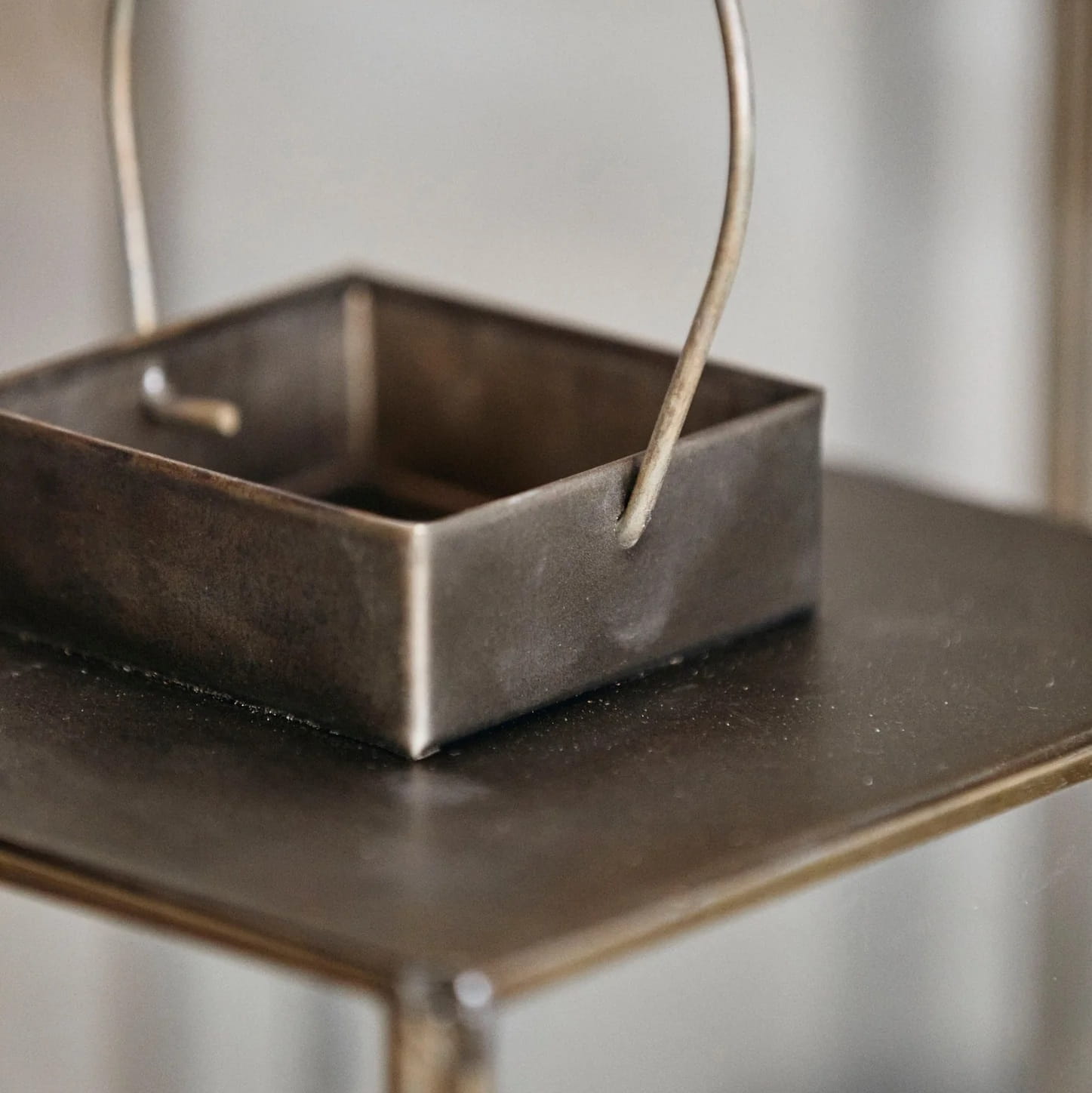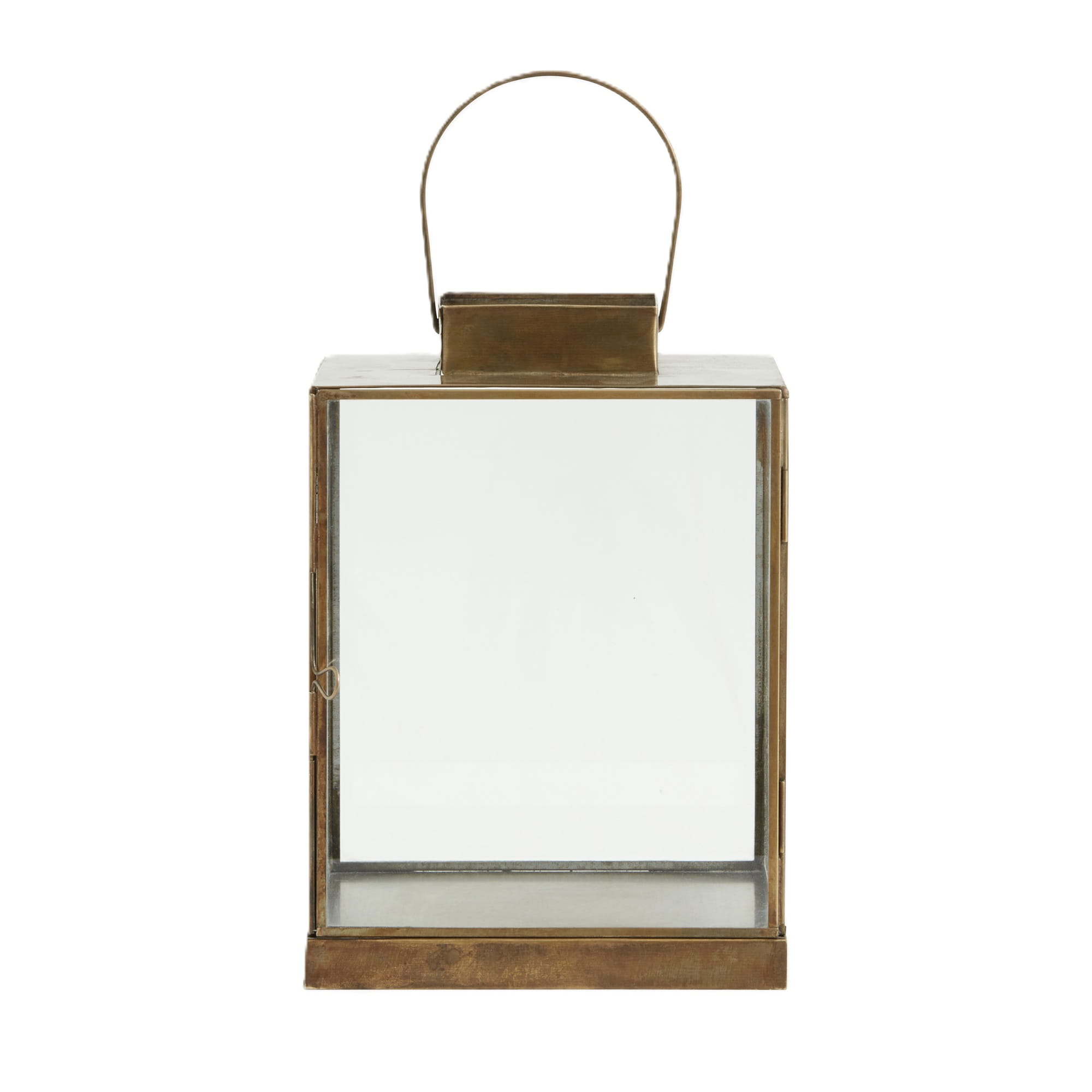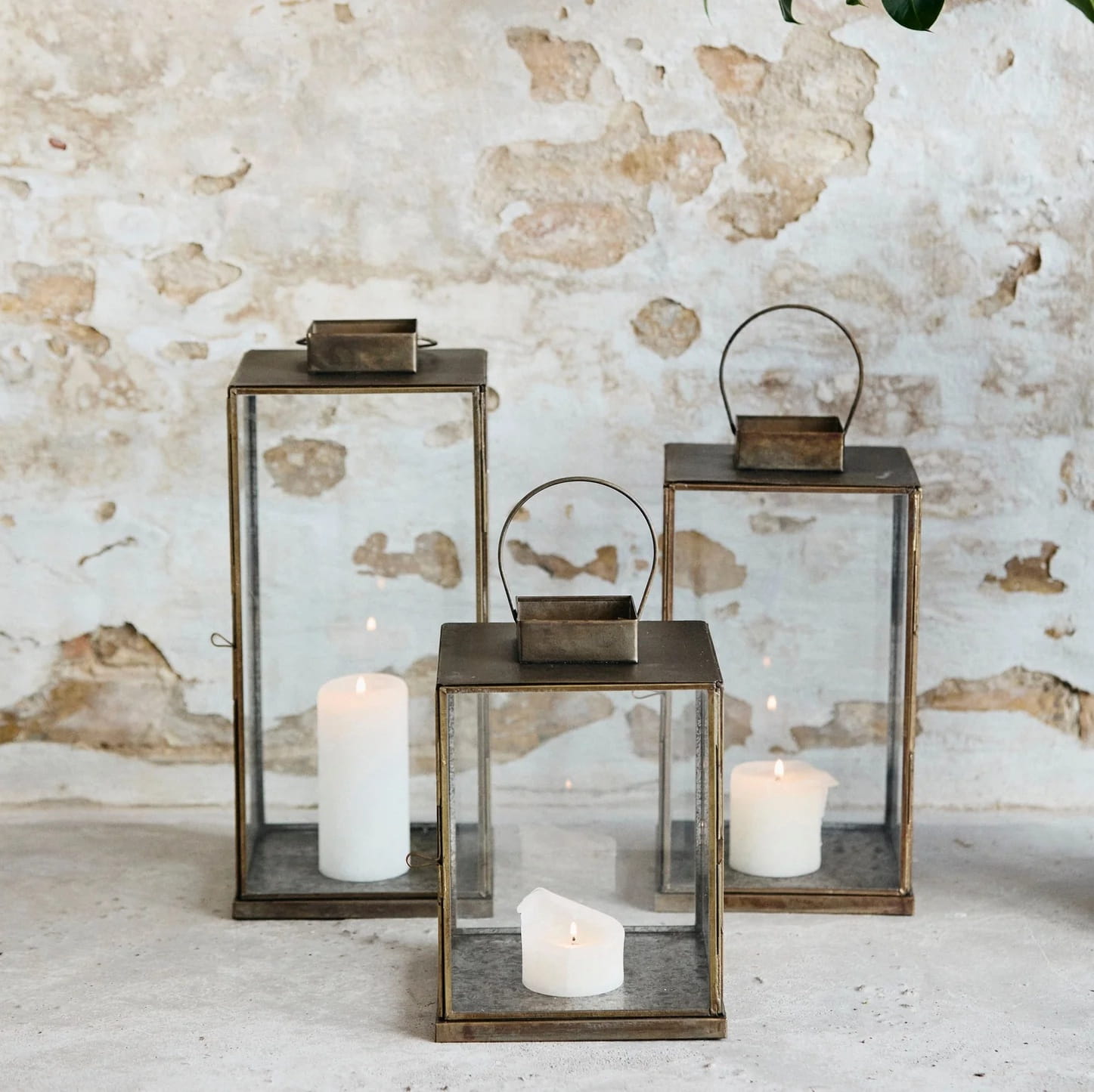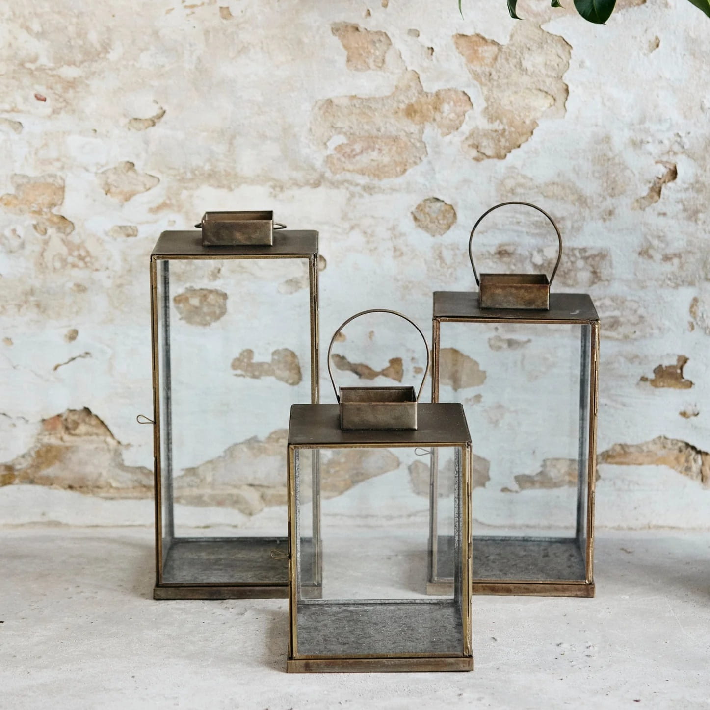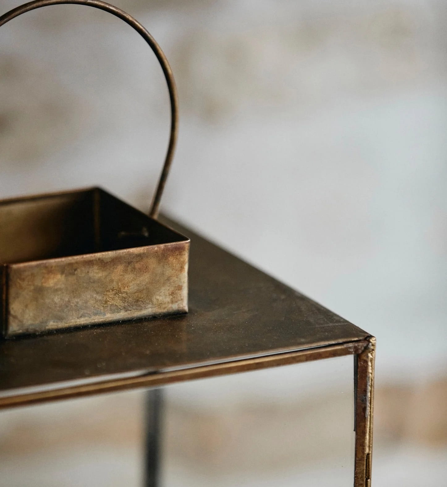 Lampion Antique wykonany jest z żelaza i szkła, a jego powierzchnia została celowo postarzana w odcieniu złotego mosiądzu, aby uzyskać efekt szlachetnej patyny. Dzięki temu każdy szklany lampion dekoracyjny ma indywidualny charakter i subtelnie różni się odcieniem oraz wykończeniem. Antyczne złoto pięknie współgra ze światłem świecy, tworząc miękką, przytulną poświatę szczególnie widoczną po zmroku.