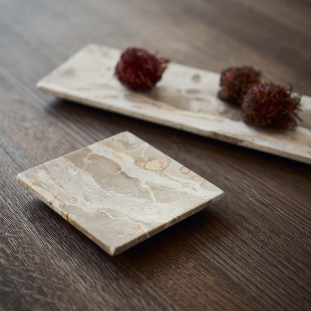 Wskazówka: aby zachować naturalne piękno marmuru, czyść tacę ręcznie przy użyciu miękkiej ściereczki i łagodnego środka czyszczącego. Unikaj kontaktu z silnymi detergentami i kwasami.