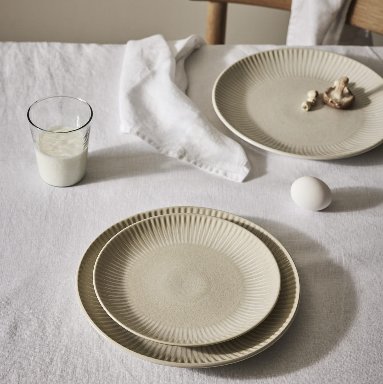 Każdy talerz został ręcznie wykonany w Portugalii z wysokiej jakości kamionki, co gwarantuje trwałość i niepowtarzalny charakter. Reaktywne szkliwo użyte w procesie wypału tworzy wyjątkowe niuanse kolorystyczne, dzięki czemu każdy talerz jest unikatowy. Kremowo-białe i beżowe odcienie z delikatnym pół-połyskiem oraz pięknie żebrowane brzegi sprawiają, że talerze prezentują się niezwykle elegancko i dodają aranżacji stołu rustykalnej, a zarazem luksusowej nuty.