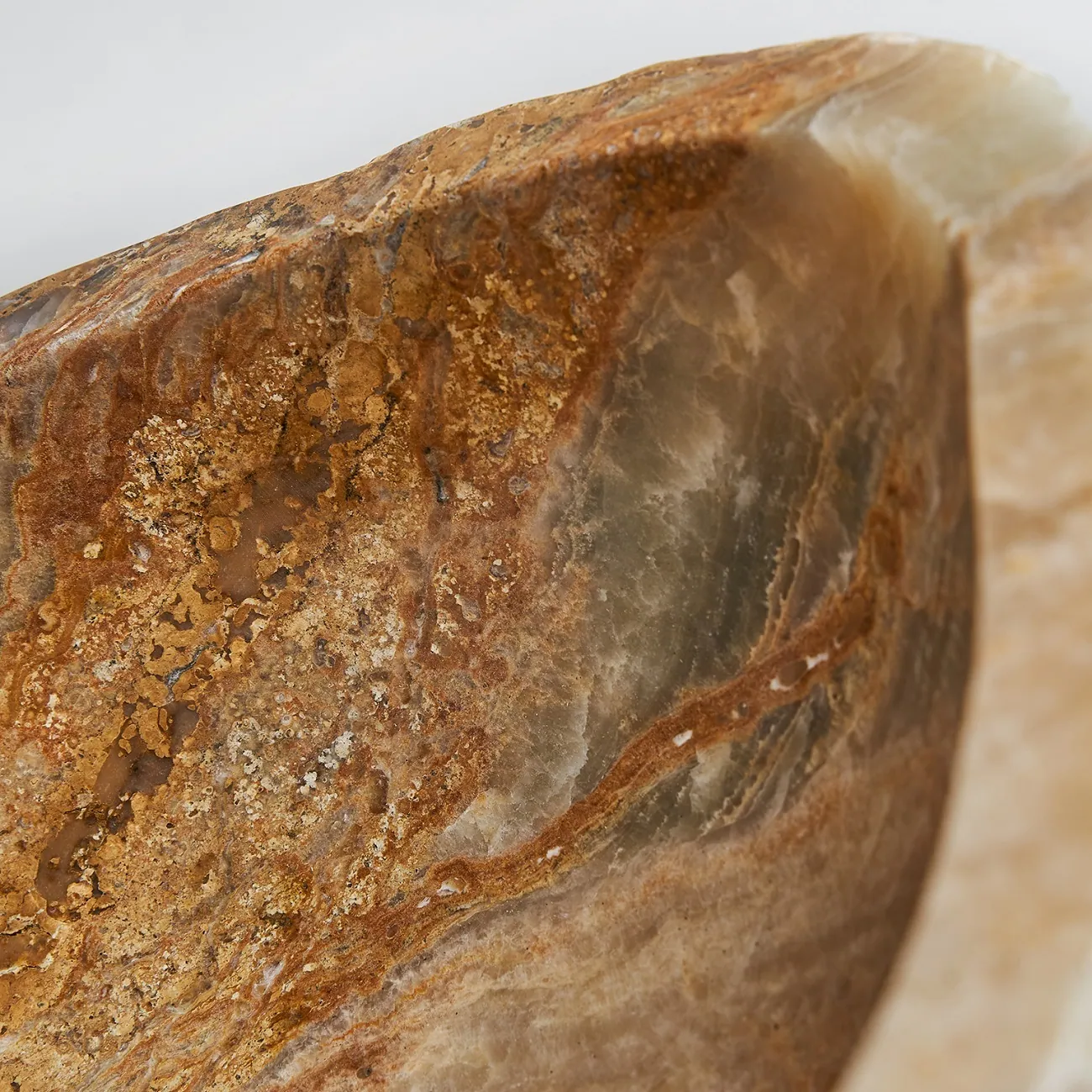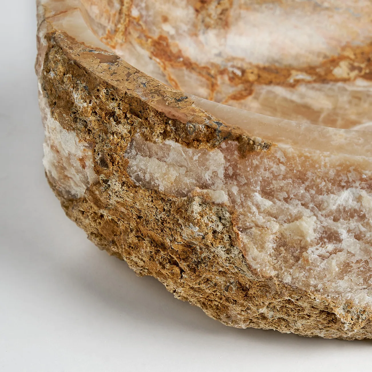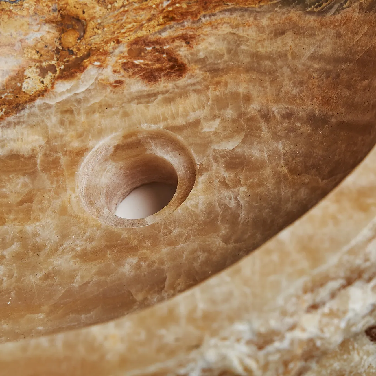 Onyks to kamień wyjątkowy nie tylko ze względu na swoje walory estetyczne, ale również na właściwości – jest symbolem prestiżu, elegancji i wyrafinowania. Naturalne przenikanie światła przez strukturę tego kamienia sprawia, że umywalka zyskuje głębię, szczególnie w odpowiednim oświetleniu. W połączeniu z marmurowym blatem, drewnem egzotycznym lub surowym betonem tworzy spektakularny efekt, który podkreśla jej szlachetną estetykę.