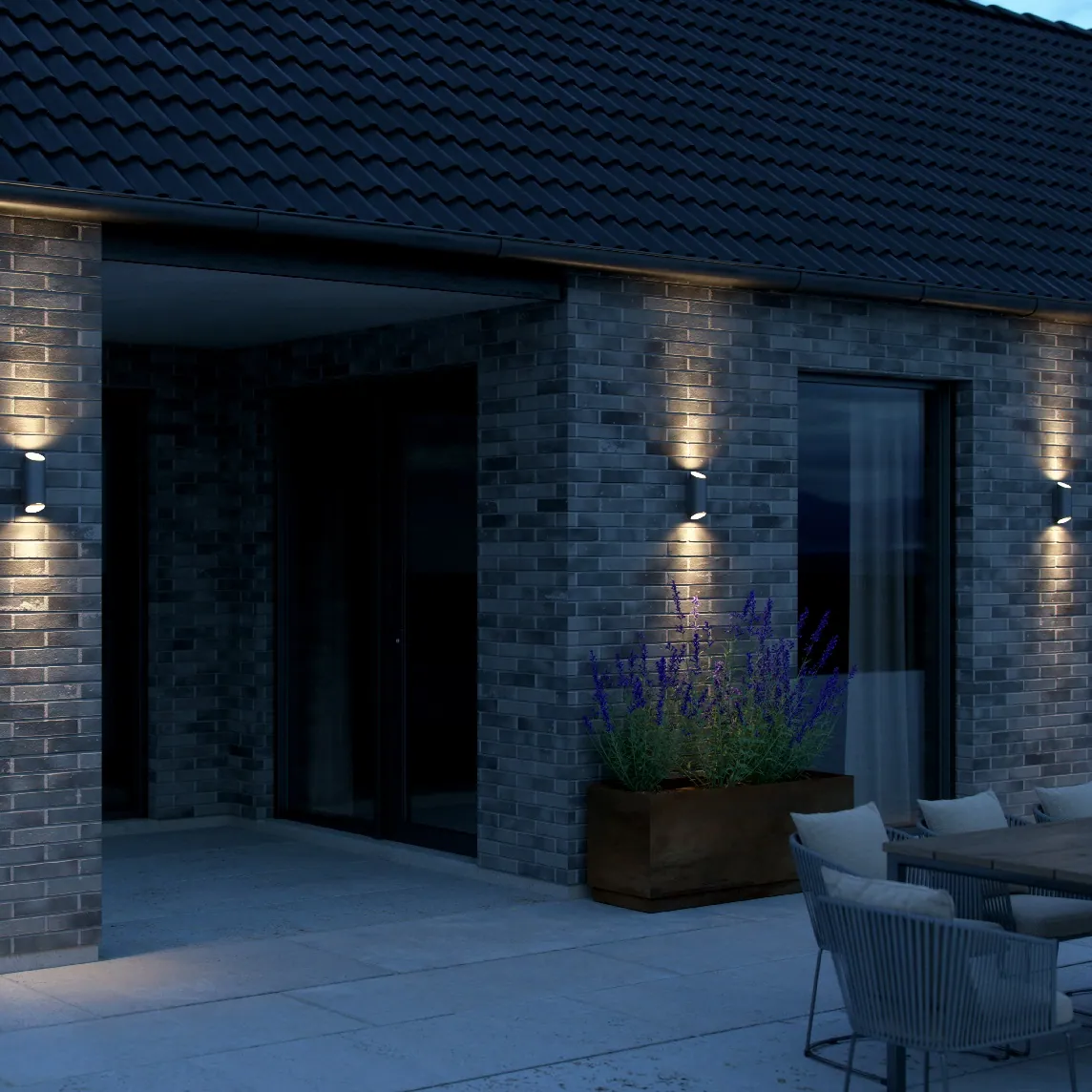 Kinkiet elewacyjny Nico Round to kinkiet zewnętrzny o eleganckim i nowoczesnym wzornictwie. Minimalistyczna forma kinkietu na dom rzuca światło zarówno w górę, jak i w dół, tworząc elegancki efekt świetlny na elewacji budynku.