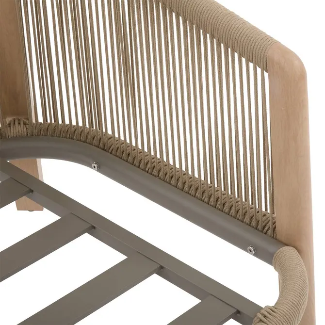 Wygodny fotel na balkon i do ogrodu Nelora z aluminiową konstrukcją o wykończeniu imitującym drewno oraz plecionką rope to fotel ogrodowy lounge z niskim siedziskiem i grubymi poduszkami olefin, zaprojektowany do tworzenia eleganckiej strefy relaksu na tarasie, balkonie, patio i w ogrodzie. Konstrukcja z aluminium zabezpieczona epoksydowo, poduszki z tkaniny odpornej na wilgoć i promieniowanie UV oraz regulowane stopki sprawiają, że to rozwiązanie do świadomej aranżacji przestrzeni outdoor.