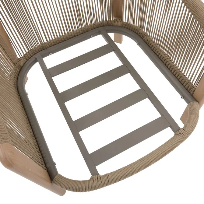 Model Nelora został zaprojektowany z aluminium o wykończeniu imitującym drewno. Całość konstrukcji opleciona jest dekoracyjną plecionką ze sznurka z włókna syntetycznego, co nadaje mu wyraźny, dopracowany charakter.