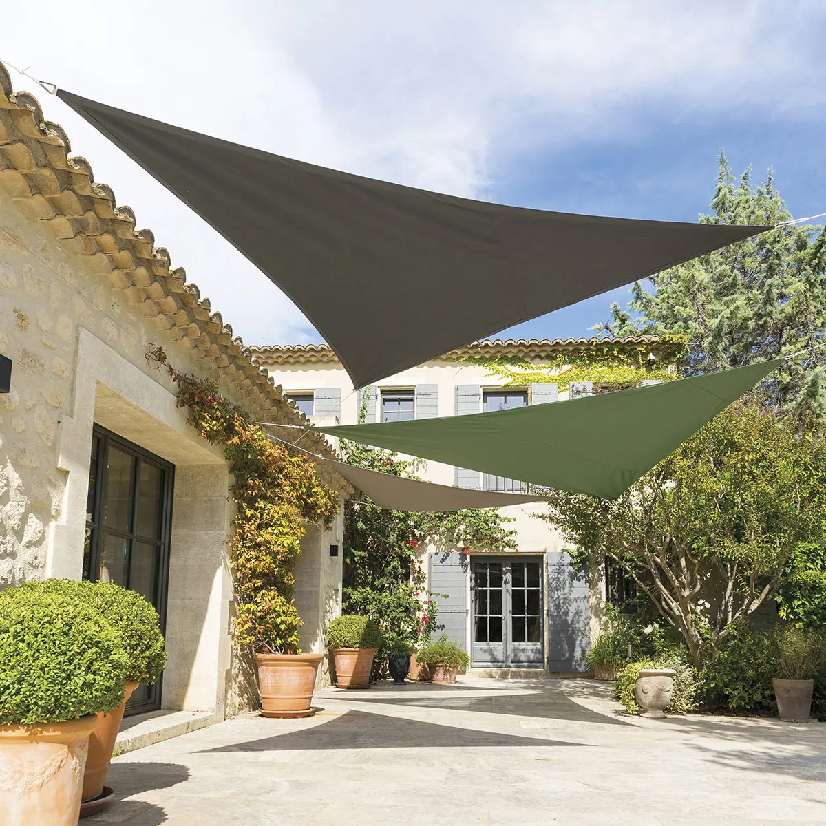 Żagiel ogrodowy trójkątny Shae, marki Hesperide (specjalizującej się w produkcji mebli i akcesoriów ogrodowych) to praktyczne wyposażenie tarasu lub ogrodu, aby stworzyć zacieniony obszar i cieszyć się przestrzenią na świeżym powietrzu, ochronić od słońca i promieniowania UV.